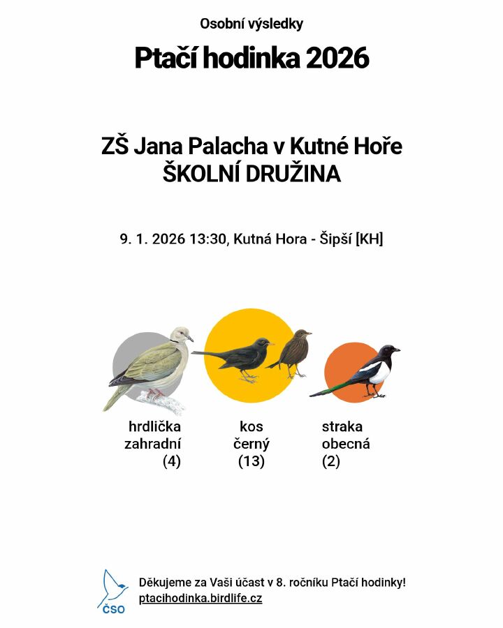 Dne 9. ledna jsme se zapojili do celostátní akce Ptačí hodinka. Společně jsme pozorovali a sčítali ptáky v okolí školy, učili se rozpoznávat jednotlivé druhy. Aktivita byla pro děti zajímavým zpestřením činnosti ve školní družině a přispěla k rozvoji jejich vztahu k přírodě.