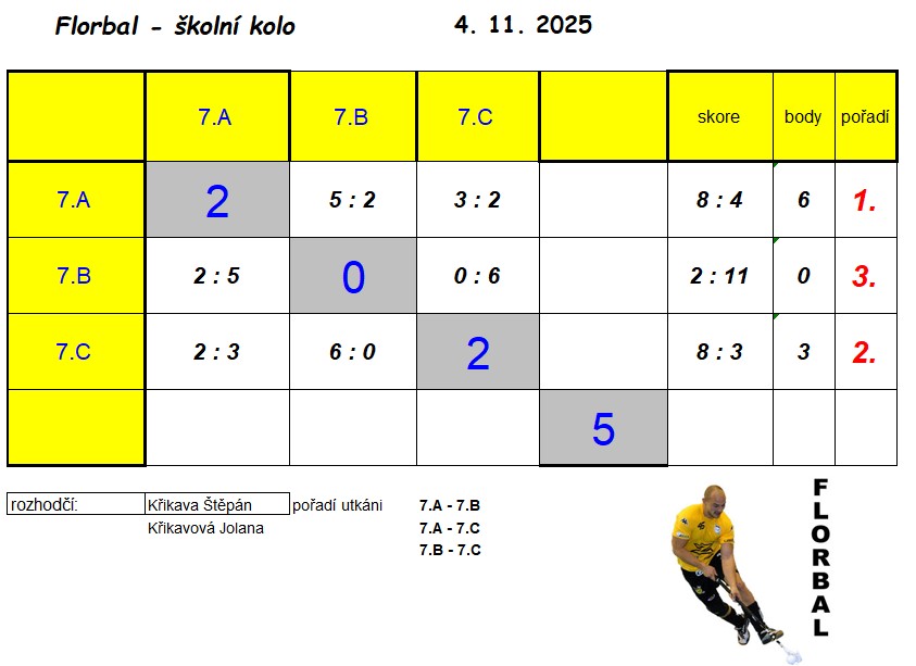 V úterý 4. listopadu se na naší škole uskutečnil školní florbalový turnaj 7. ročníku. Každá třída postavila svůj vlastní tým složený ze sedmi hráčů, přičemž v každém týmu musela být aspoň jedna dívka.