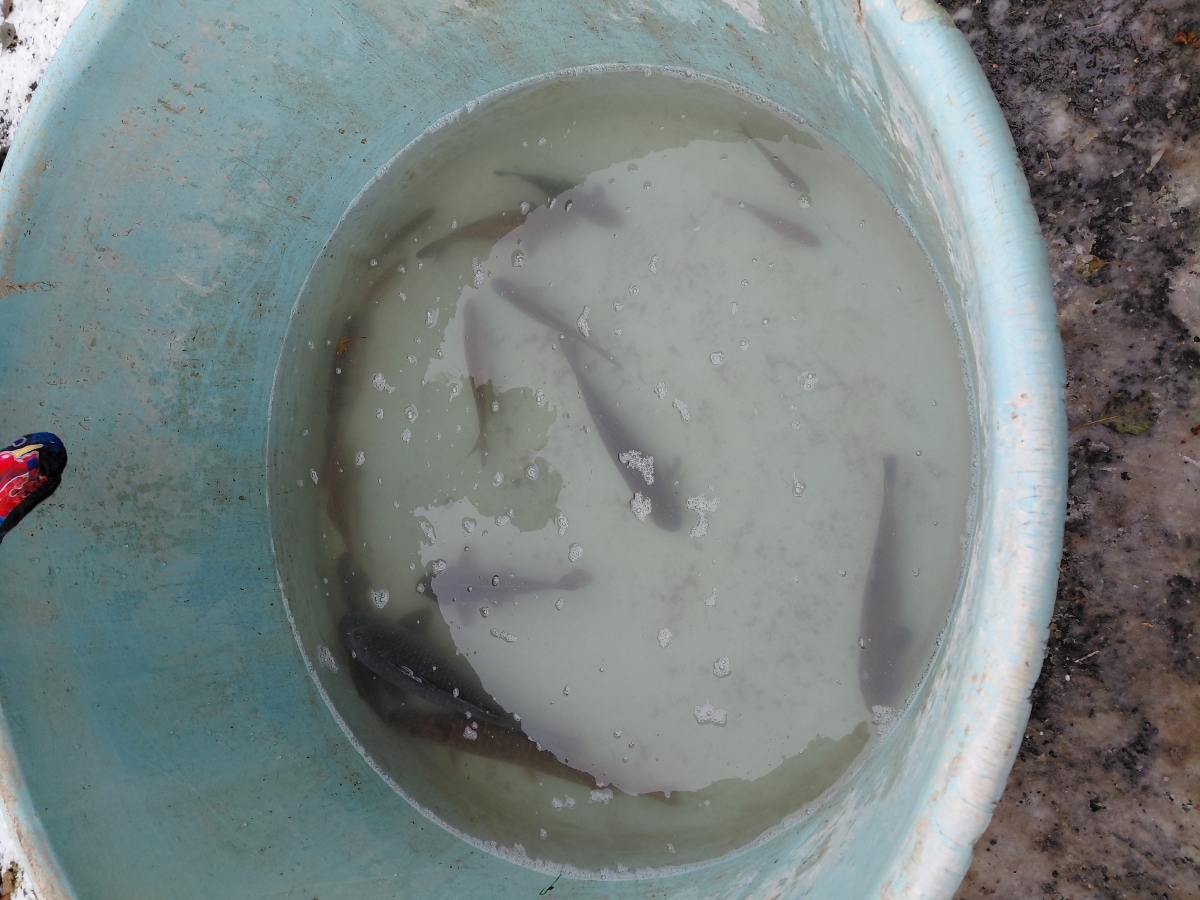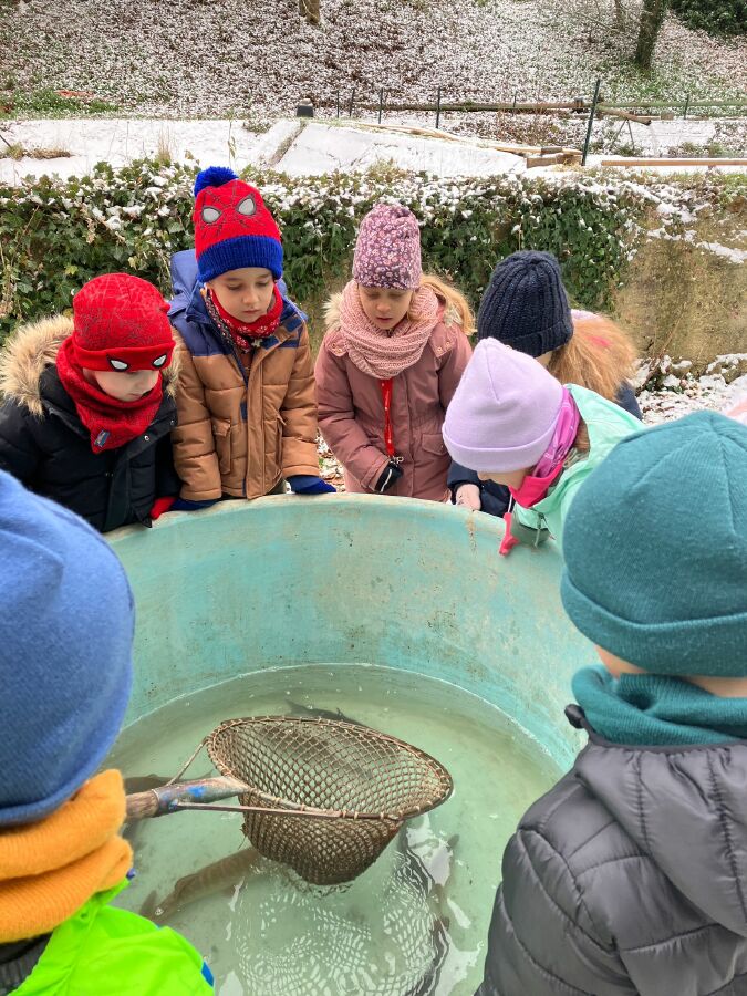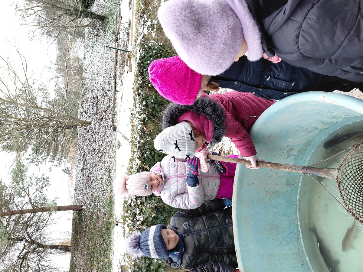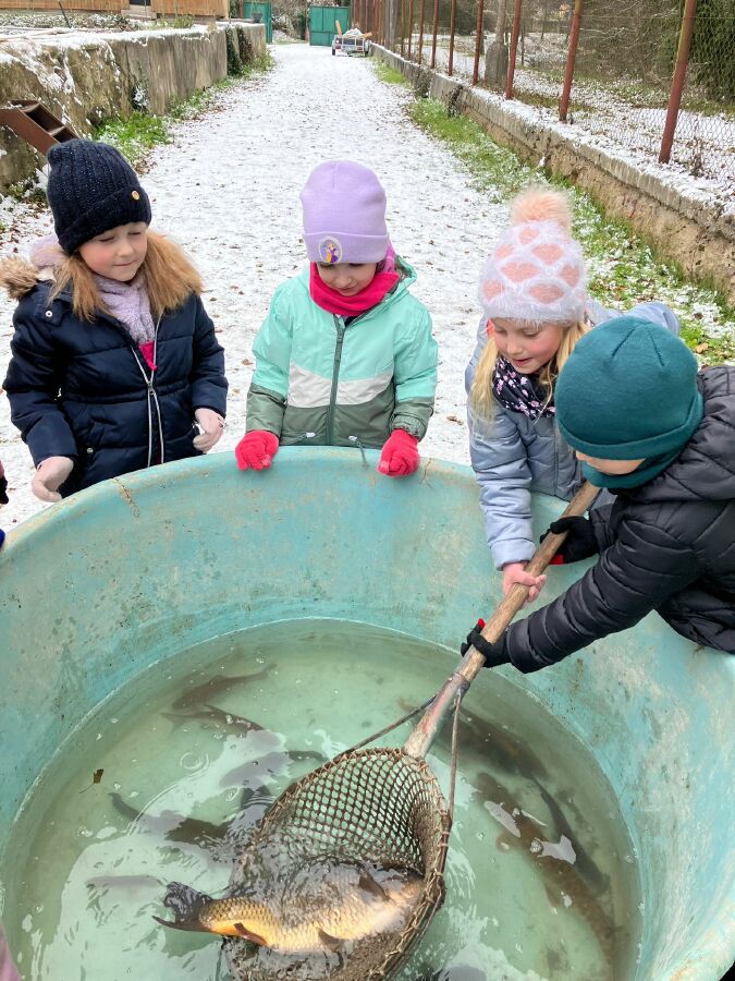 Děti si prohlédly vypuštěný a zasněžený rybník. Dozvěděly se něco z jeho historie a to, jak se do něj dostává voda. Prohlédly si sádky, kde odpočívali a čekali vánoční kapři. Ale hlavně si zahrály na rybáře. Lovily ryby v kádi což byla velká zábava.