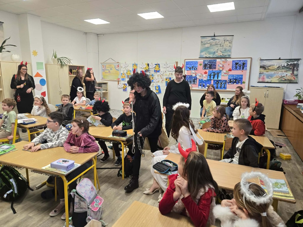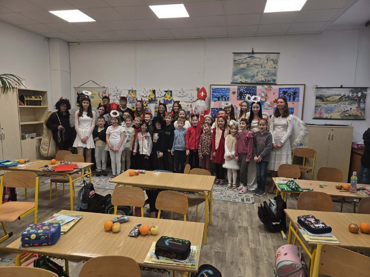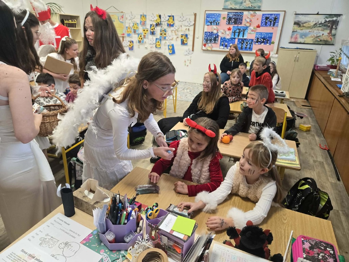 Dnešek byl pro 2.B ve znamení čertů a andělů. Už od rána jsme všichni netrpělivě vyhlíželi Mikuláše se svou družinou a třetí hodinu jsme se konečně dočkali. Zazpívali jsme mu koledu a on nás za to obdaroval malou pozorností. Celým dnem nás Mikuláš, čerti o andílci provázeli v podobě projektového vyučování, kde jsme opravovali čertovské příklady, počítali balíčky od Mikuláše, zahráli si běhací diktát a mnoho dalšího. Den se všem moc líbil, už se těšíme na další rok.