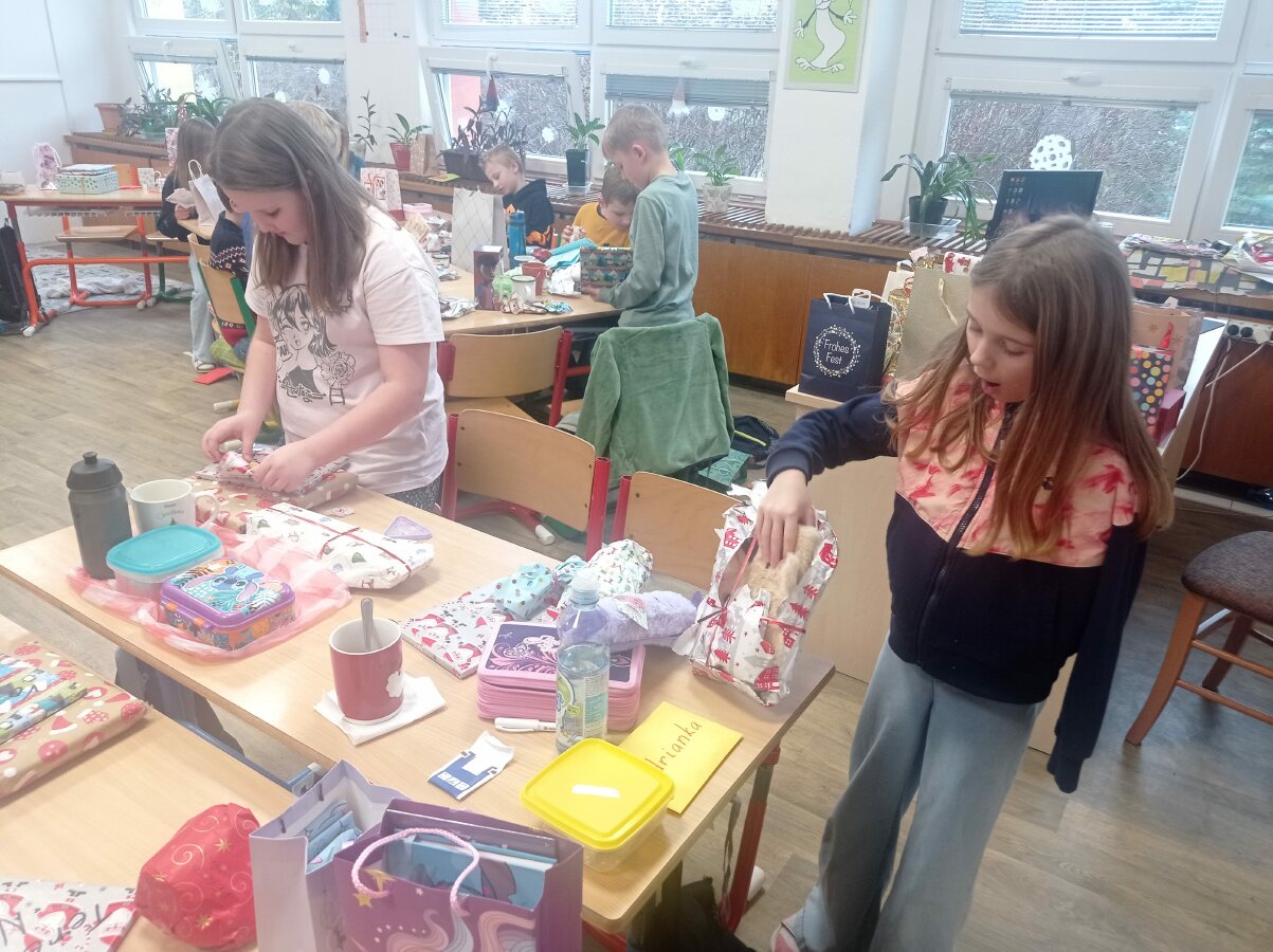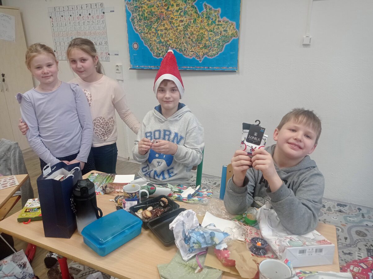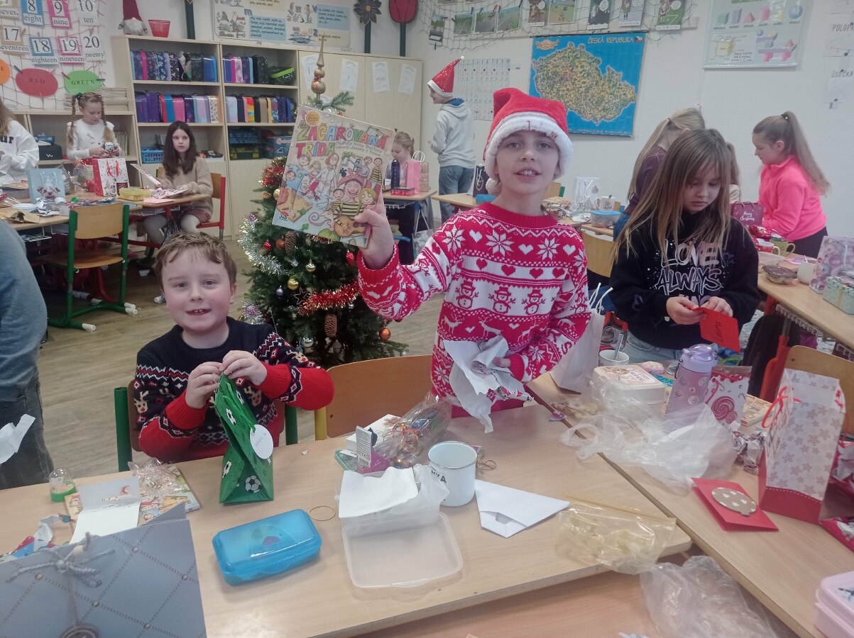 Poslední školní den před vánočními svátky byl tradičně věnován samotným třídám. My jsme si ráno vyjeli ještě zaplavat a po návratu do školy jsme si zahráli na Ježíšky a nadělili si pod stromeček spoustu dárečků. Potom jsme si udělali čaj a dali si k němu cukroví a vánoční pohádku. Potom už přišlo rozbalování!!! ![]()