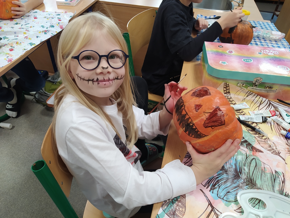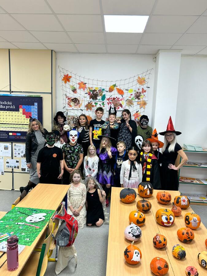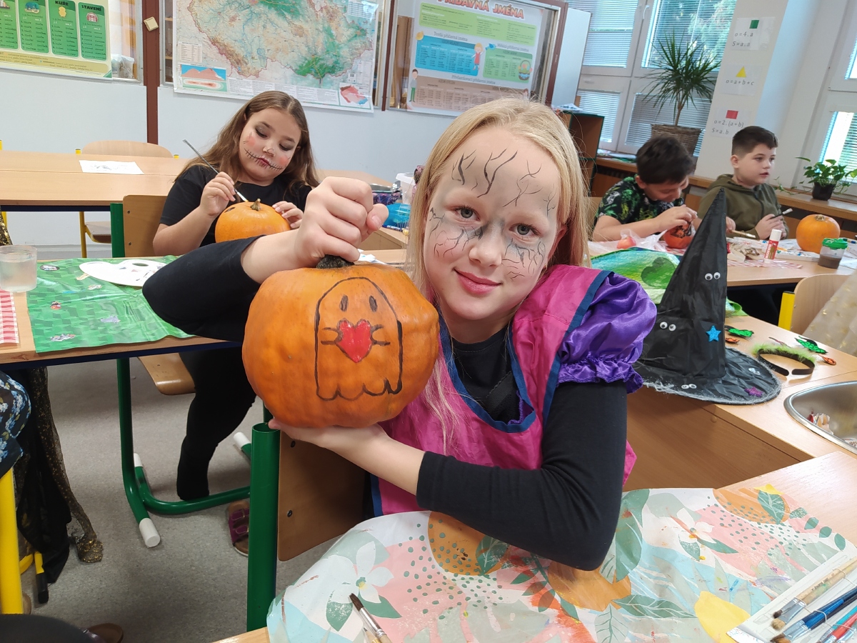Čekala nás halloweenská čeština, kde žáci plnili úkoly na stanovištích. V matematice zase počítali nejrůznější příklady a díky nim postupně vznikl tajemný halloweenský obrázek. Poté se pustili do tvoření - namalovali si nádherné strašidelné dýně, které ozdobily naši třídu.
