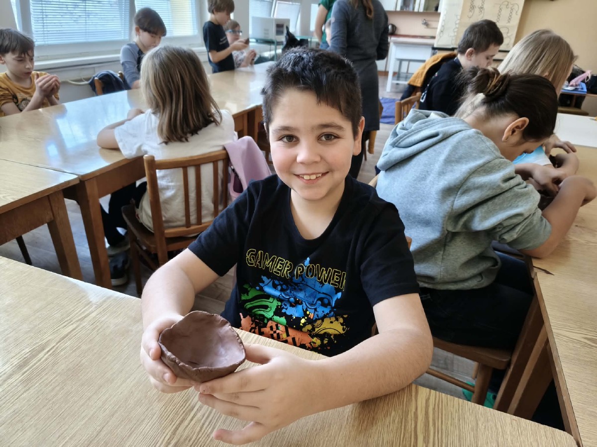 Na závěr si všichni vyrobili vlastní výrobek z hlíny – talíř, mističku, zvířátko nebo hrnek. Děti pracovaly s nadšením a radostí.