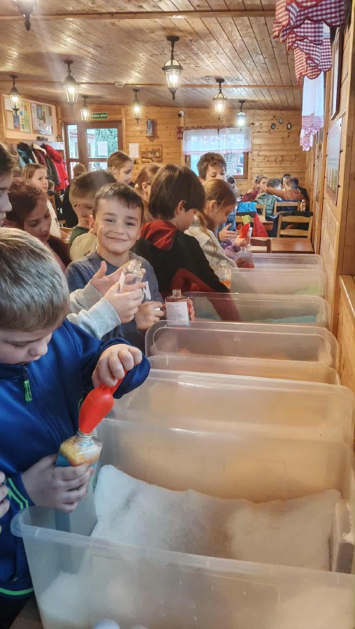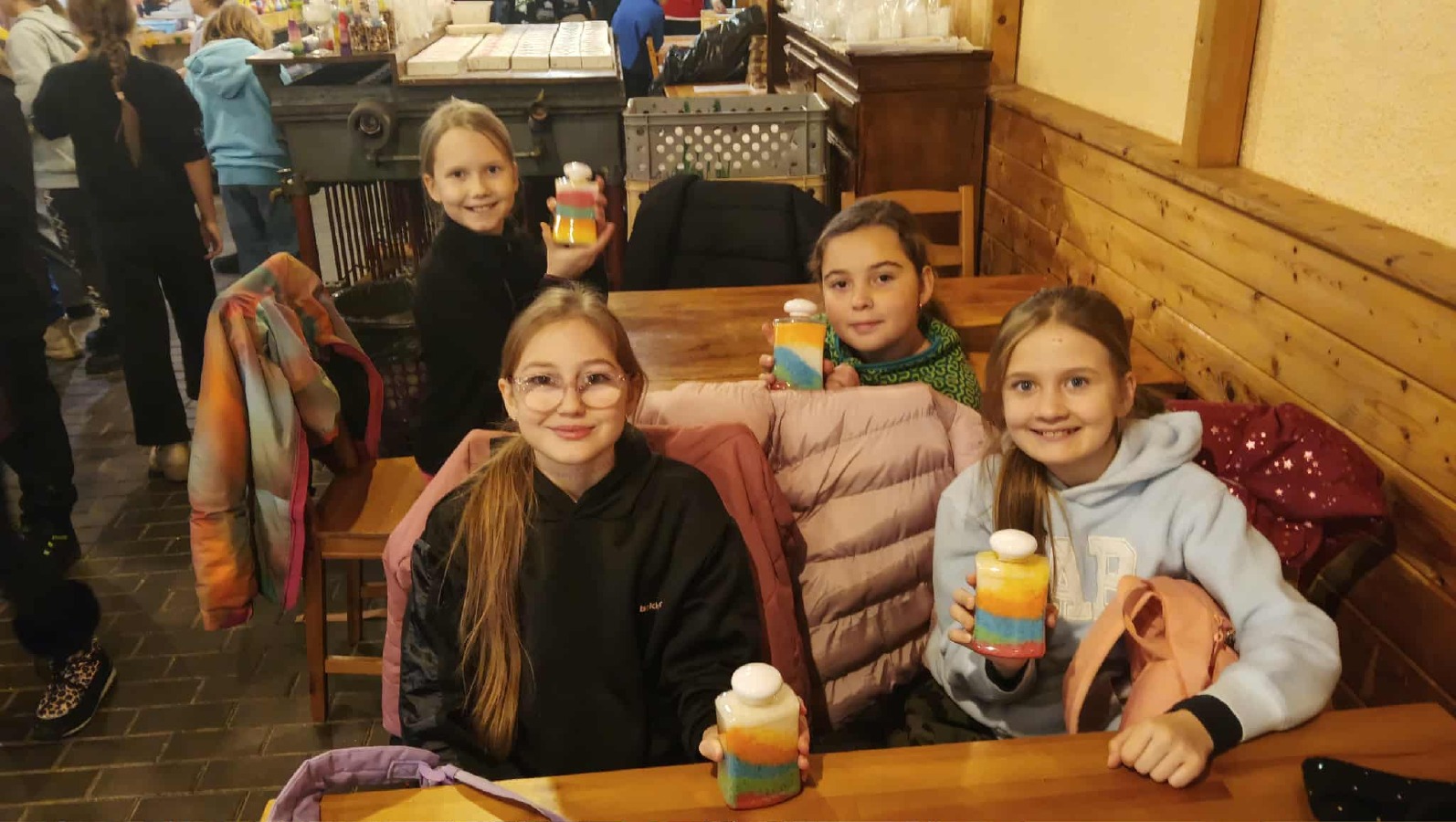 Součástí programu bylo máčení svíčky ve vosku. Dále si děti naplnily lahvičky mořskou solí a odlévaly vosk do připravených formiček. Domů si každý odvezl vlastnoručně vyrobené dárky.