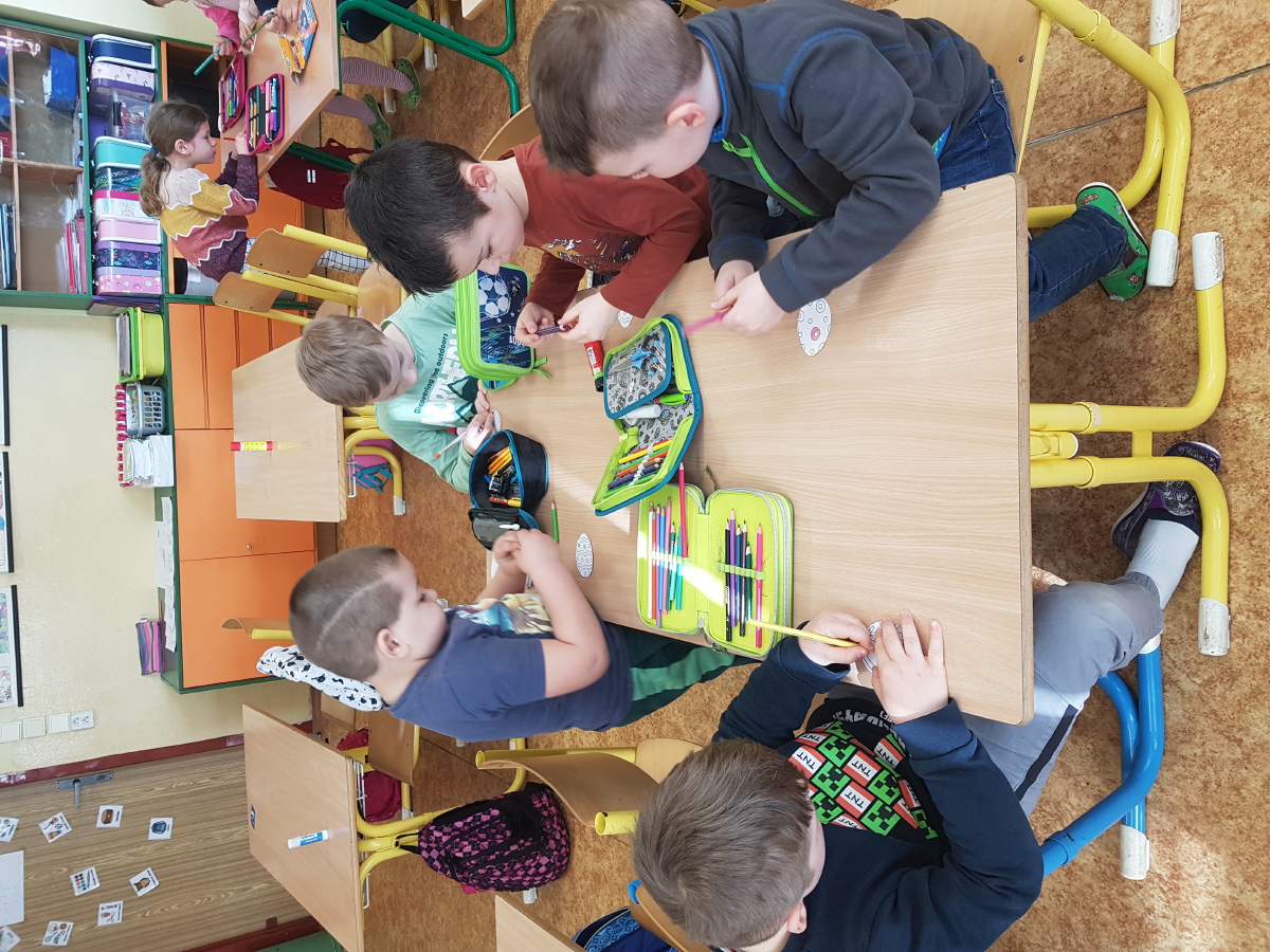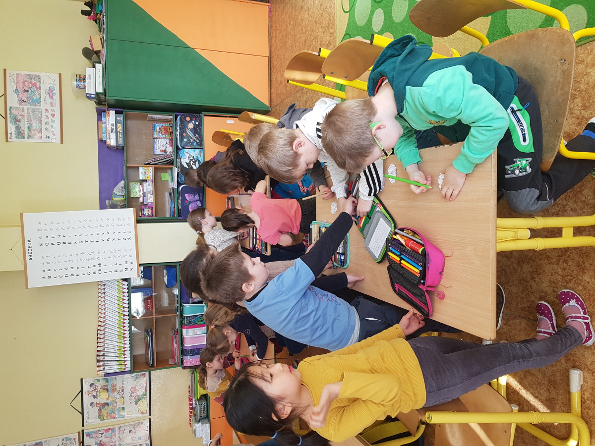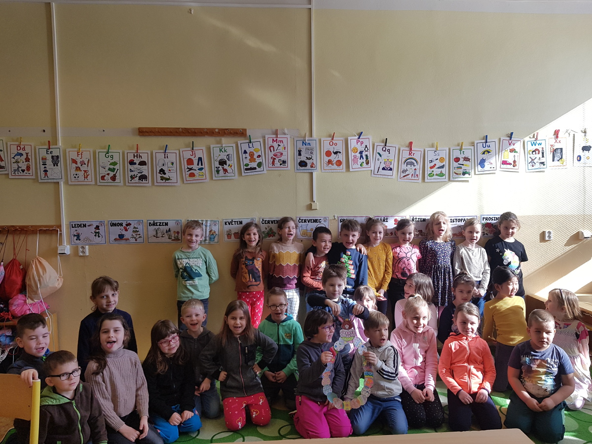 Prvňáčci dnes měli perný den. Nejdříve nás navštívili předškoláci z MŠ Malín. Děti se společně naučily jarní básničku, procvičily si abecedu i počítání, zahrály si na myšičky. Předškoláci si zkusili psát na tabuli a s pomocí dětí z 1. B si vyrobili velikonoční věnec, který si na památku odnesli s sebou do školky. Dostali svou první velkou jedničku a naši žáci zase velkou pochvalu za ukázkovou hodinu a pomoc mladším kamarádům.