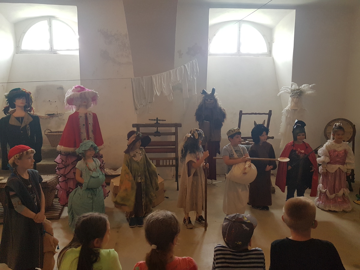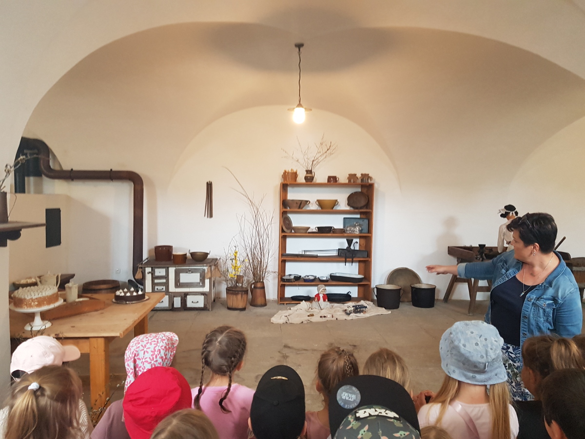 Na Kačině děti z 1. tříd navštívily divadelní pohádku i výstavu divadelních loutek a kulis. Na vlastní kůži si vyzkoušely, jak se divadelní kostýmy používají a měly možnost si zahrát dokonce i pohádku, přímo v kostýmech princezny, ježibaby, čerta, hloupého Honzy a rytíře. S paní průvodkyní si prošly sklepení zámku včetně zámecké kuchyně a konírny. Proběhly se i po okolí zámku, prošly lesní učebnu. Na závěr dne je čekal voňavý opečený špekáček s chlebem. Děti byly nadšené, výlet se povedl doslova pohádkově.