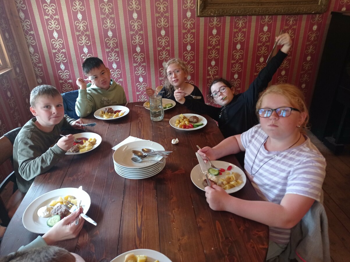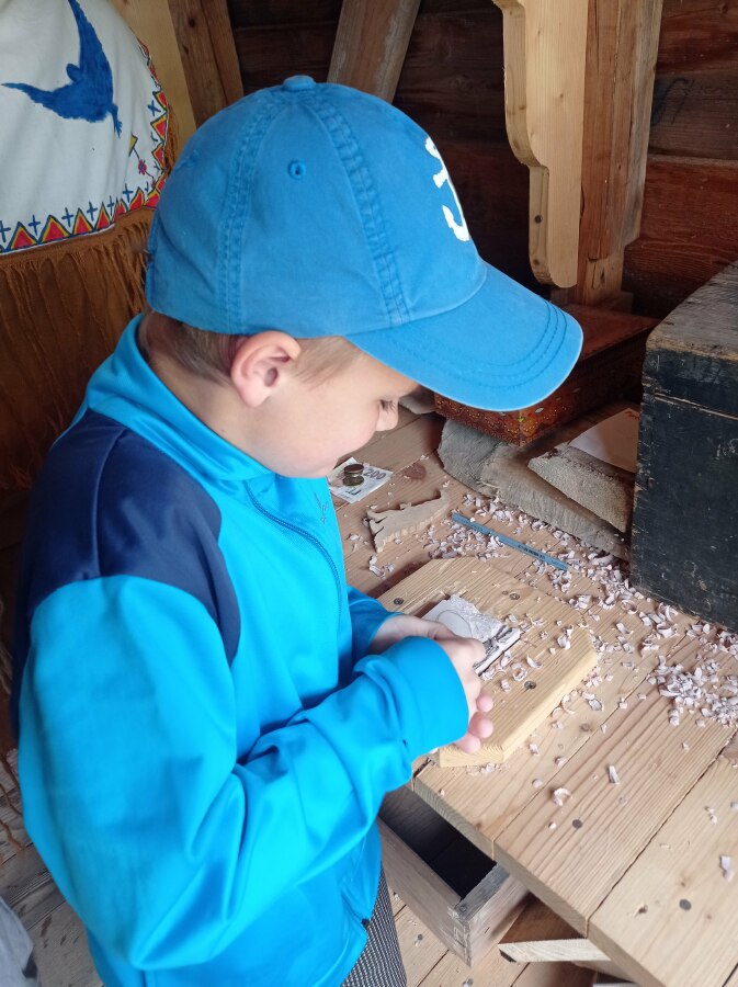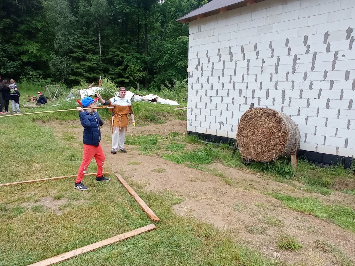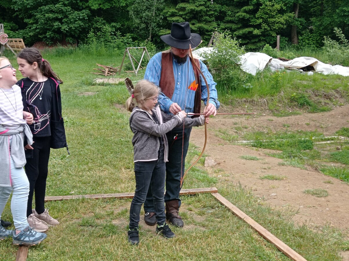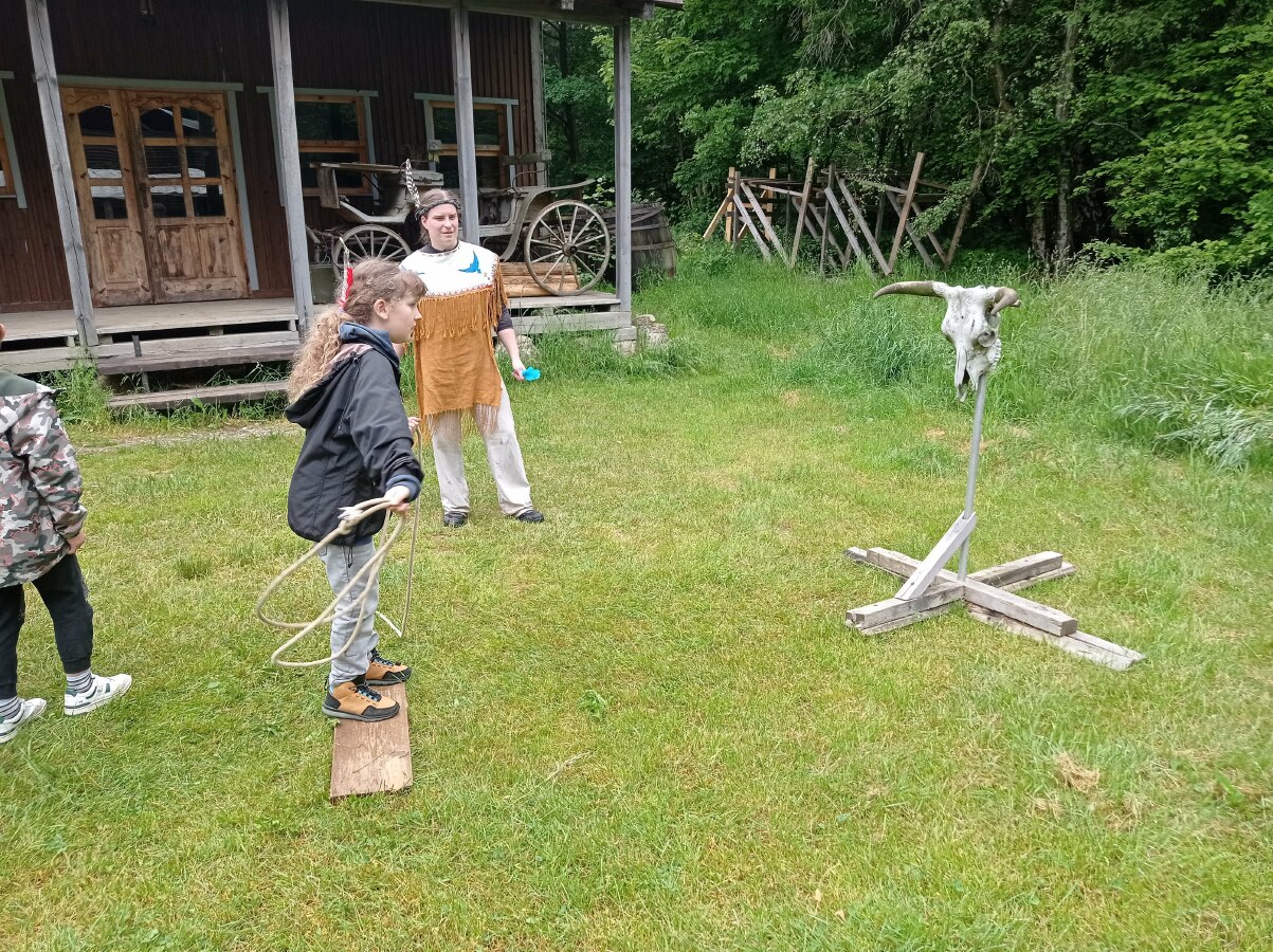 Tam už na nás čekal místní cowboy, který nás provedl městem. Navštívili jsme kostel, banku, saloon i vězení. Podívali jsme se také do malého kovbojsko-indiánského muzea a dozvěděli se spoustu zajímavostí. Potom jsme se seznámili s Indiánkou, která nám ukázala, jak se vyrábí ruční papír a jak se rýžuje zlato. A pak přišli na řadu disciplíny jako házení tomahavkem, oštěpem, či podkovou, střílení z luku a chytání krávy do lasa.