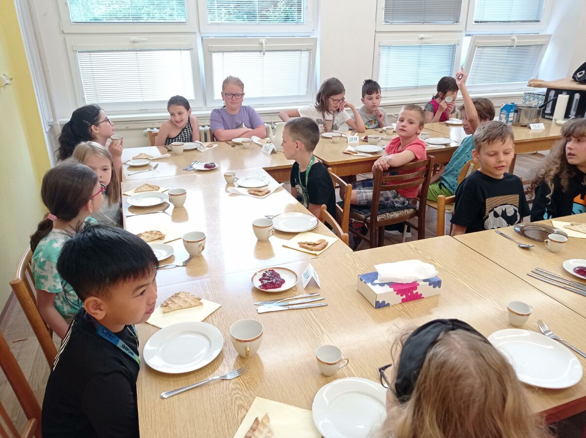 K pití byl anglický černý čaj s mlékem, ovocný čaj a džus.