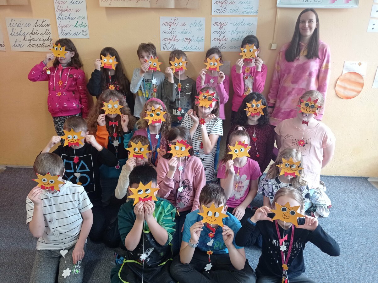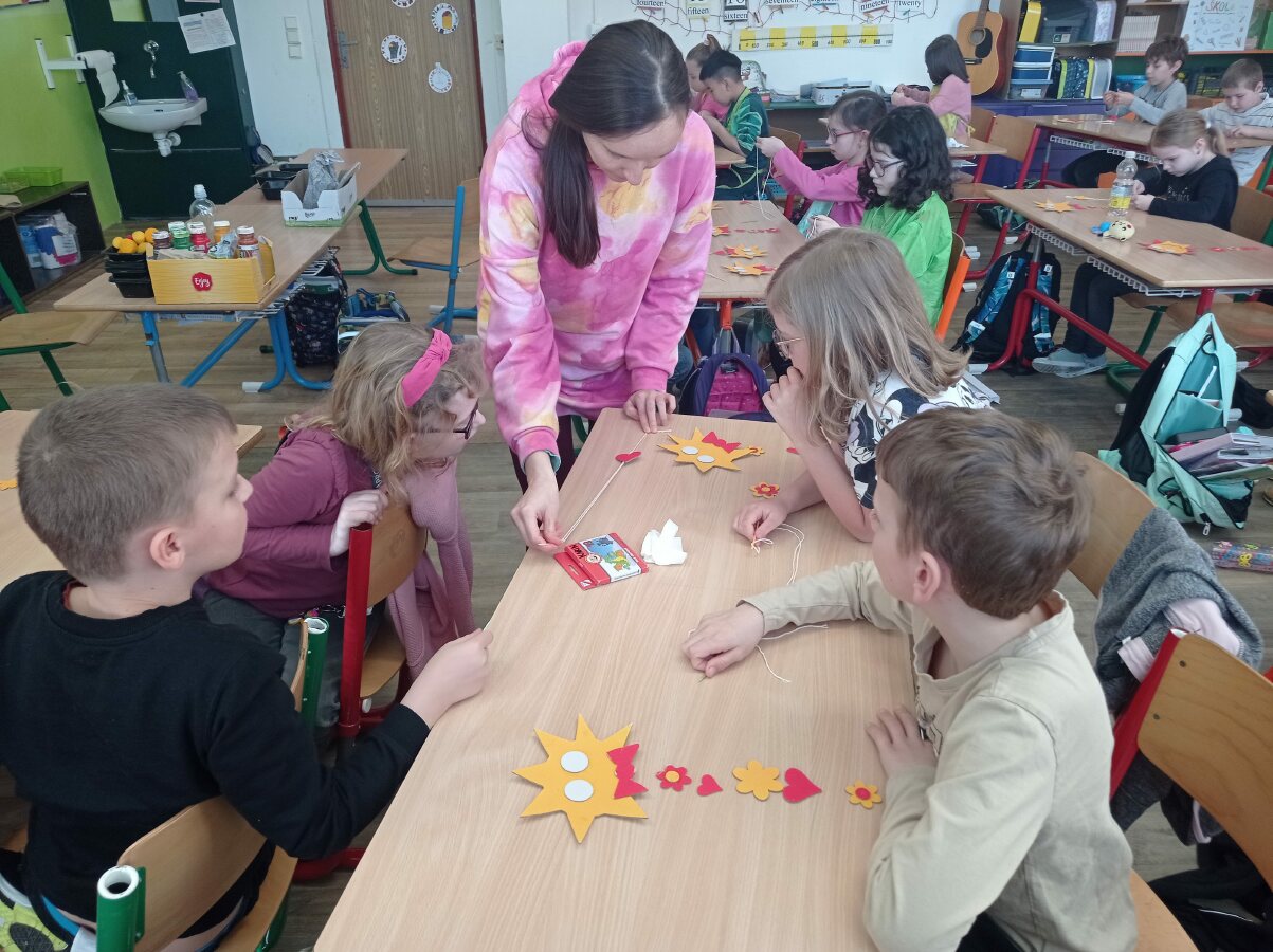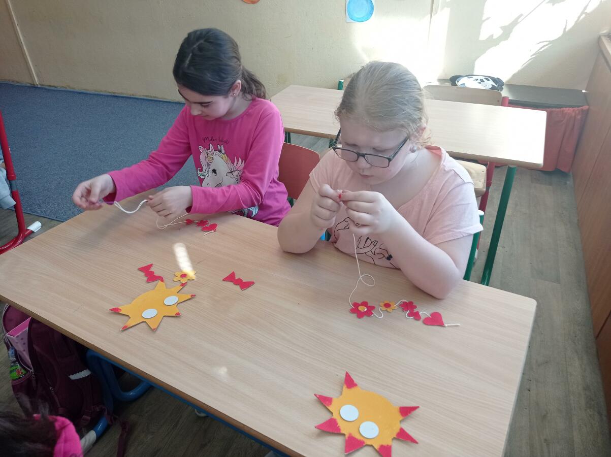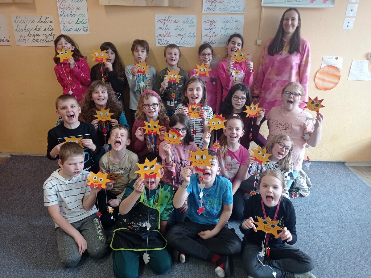 Poslední dny před Velikonocemi jsme měli plné ruce práce s výzdobou okolo nás. Nejprve jsme se snažili přilákat trochu více sluníčka a vyrobili jsme si krásný jarní sluníčkový závěs!