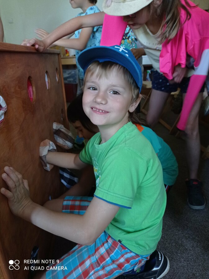 Potom jsme si otestovali, jestli poznáme různé přírodniny (kaštany, kůru, šišku, žaludy, šípek, choroše...) pouze po hmatu.