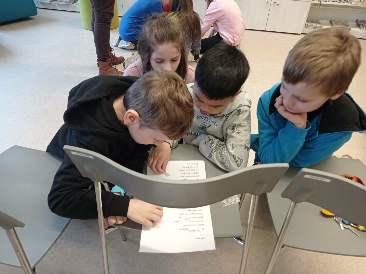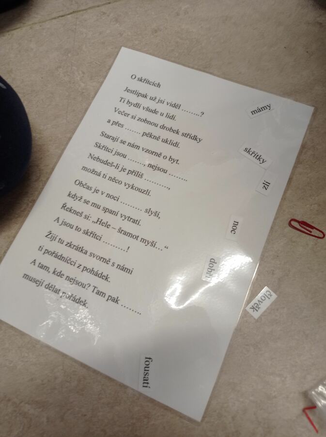 Zjistili jsme, že nepíše jen básničky pro nejmenší děti, ale i pro ty starší. Ve skupinách jsme si také zahráli na básníky a zkusili si Žáčkovy texty doplnit.