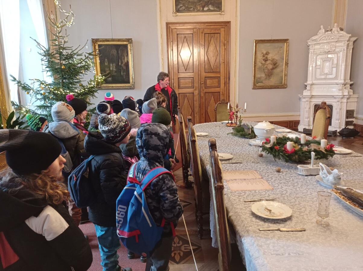 Potom jsme se vrátili do minulosti a poznávali jsme, jak se dřív slavily Vánoce na zámku. Podívali jsme se do kuchyně, kde se připravovaly dobroty na štědrovečerní tabuli. Zavítali jsme i ke stolu a ke stromečku s tehdejšími dárky.