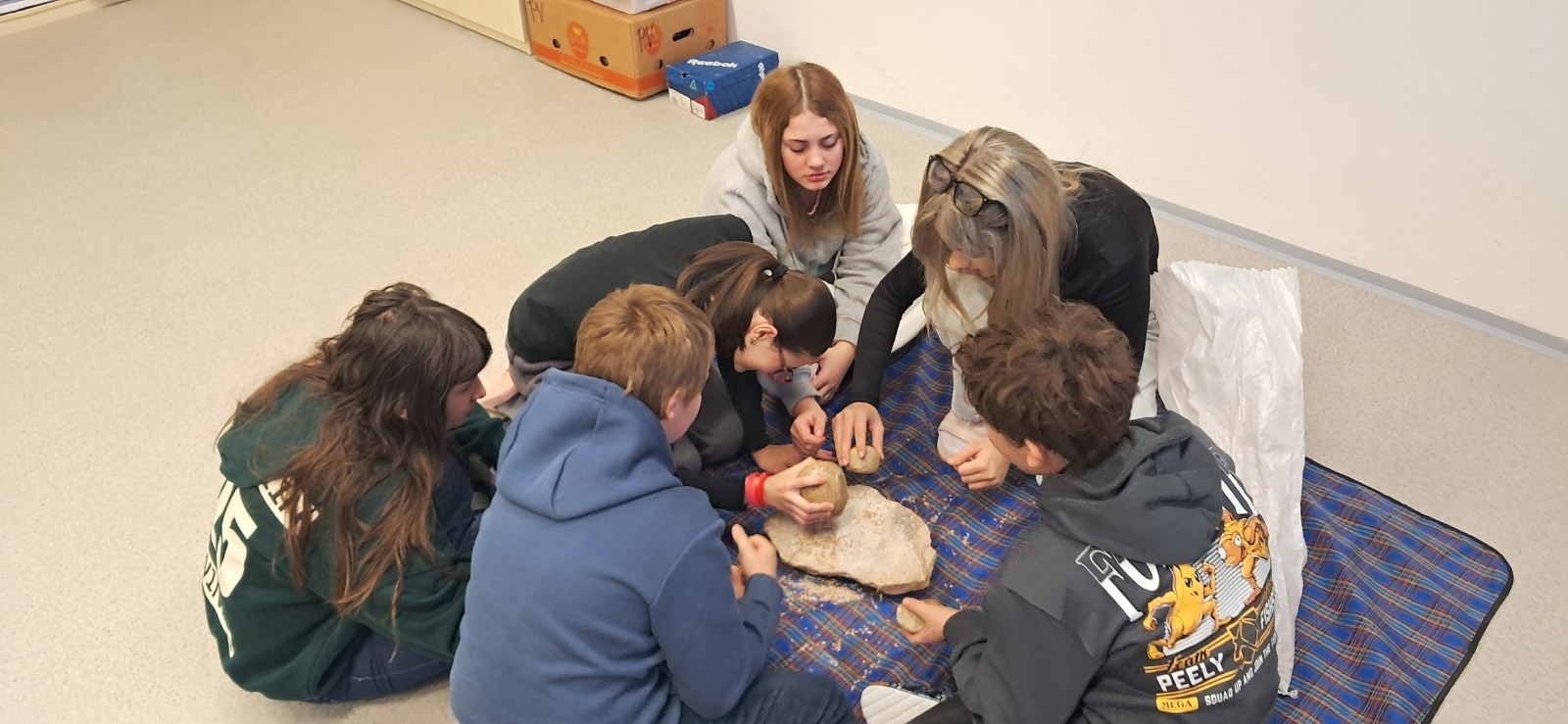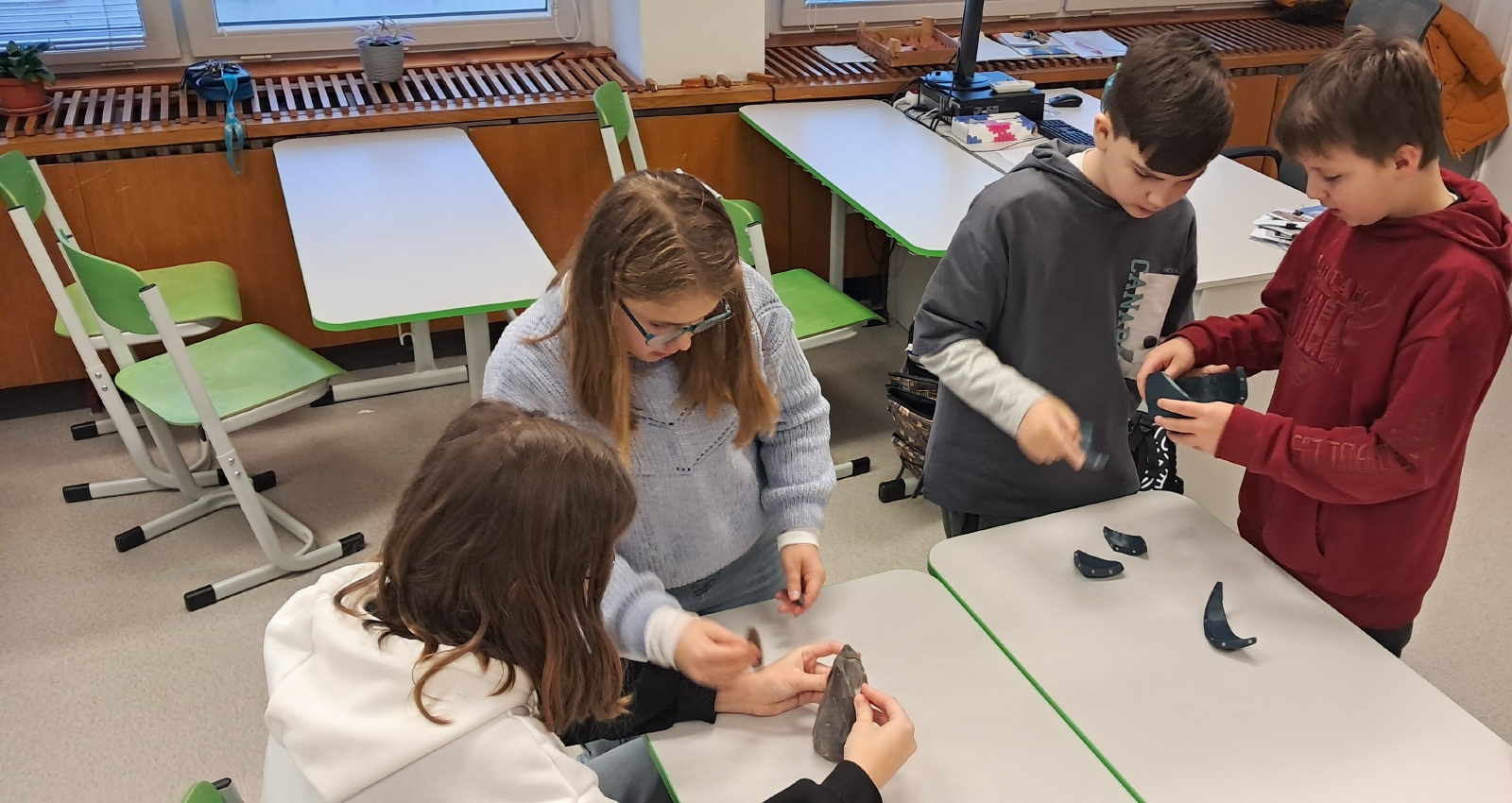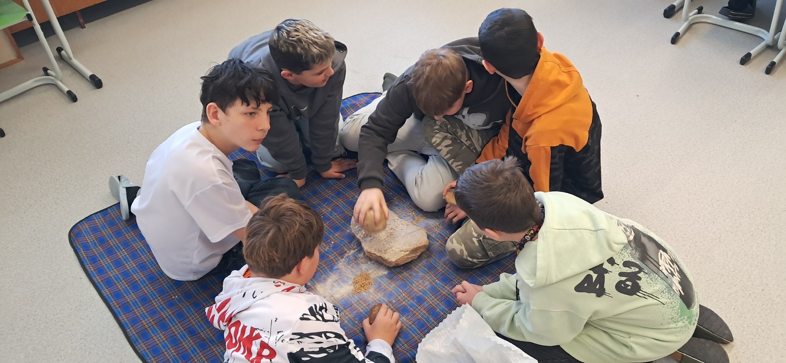 Ve středu 21. ledna zavítala do naší školy edukátorka z Českého muzea stříbra, která žáky šestých tříd provedla pravěkem. Žáci si vyzkoušeli práci archeologů při sestavování keramické misky, která se však nedochovala v celku, ale byla roztříštěná na jednotlivé kousky. Na jiném stanovišti si mohli vyzkoušet ruční mletí obilí na mouku, což byla pro tehdejší lidi v pravěku obrovská fuška.