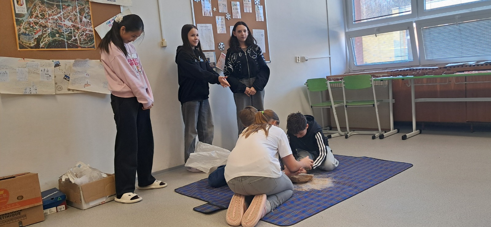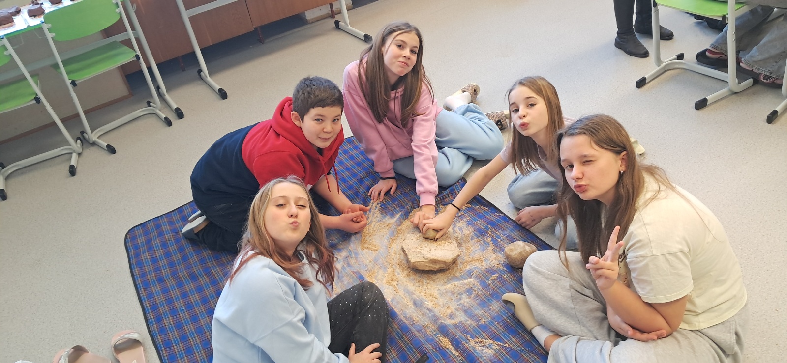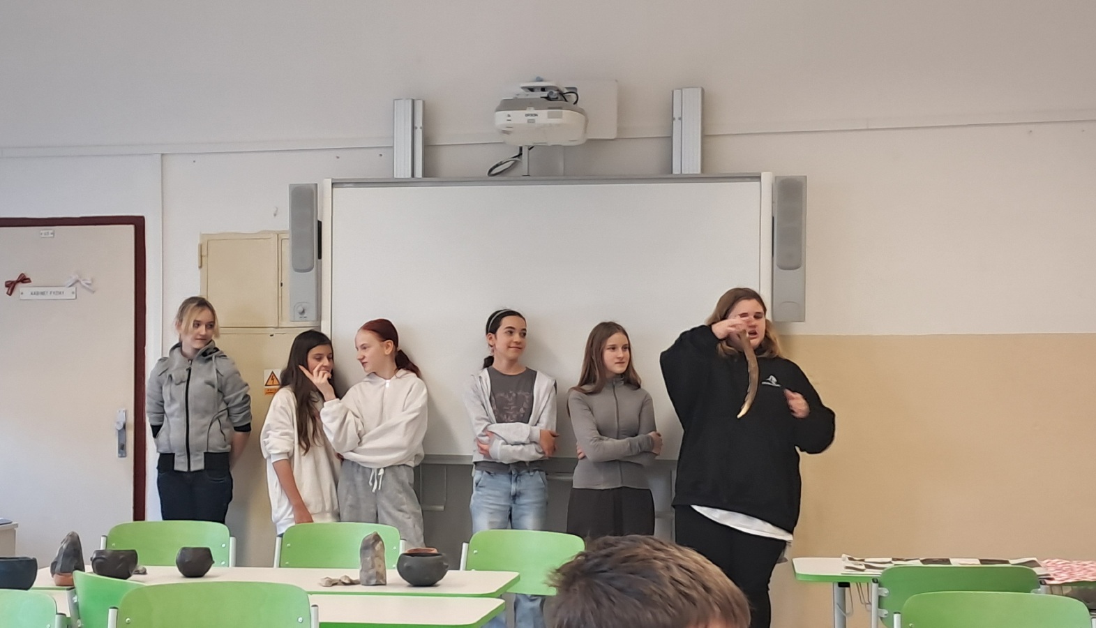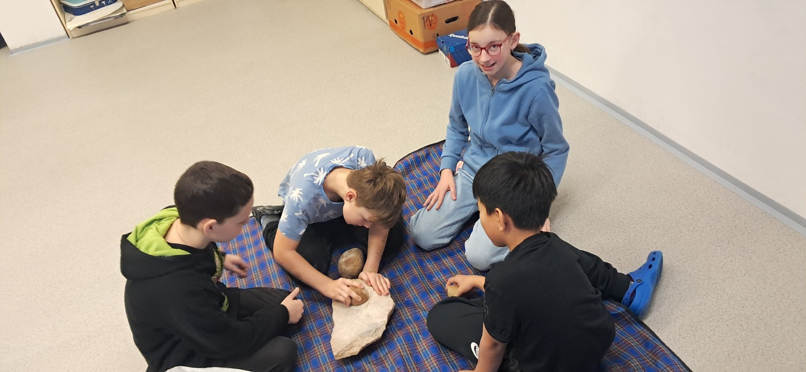 Ve středu 21. ledna zavítala do naší školy edukátorka z Českého muzea stříbra, která žáky šestých tříd provedla pravěkem. Žáci si vyzkoušeli práci archeologů při sestavování keramické misky, která se však nedochovala v celku, ale byla roztříštěná na jednotlivé kousky. Na jiném stanovišti si mohli vyzkoušet ruční mletí obilí na mouku, což byla pro tehdejší lidi v pravěku obrovská fuška.