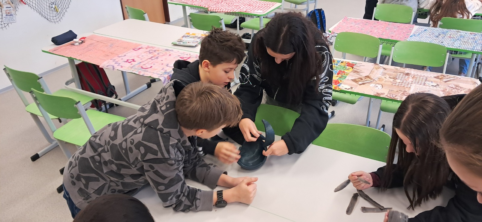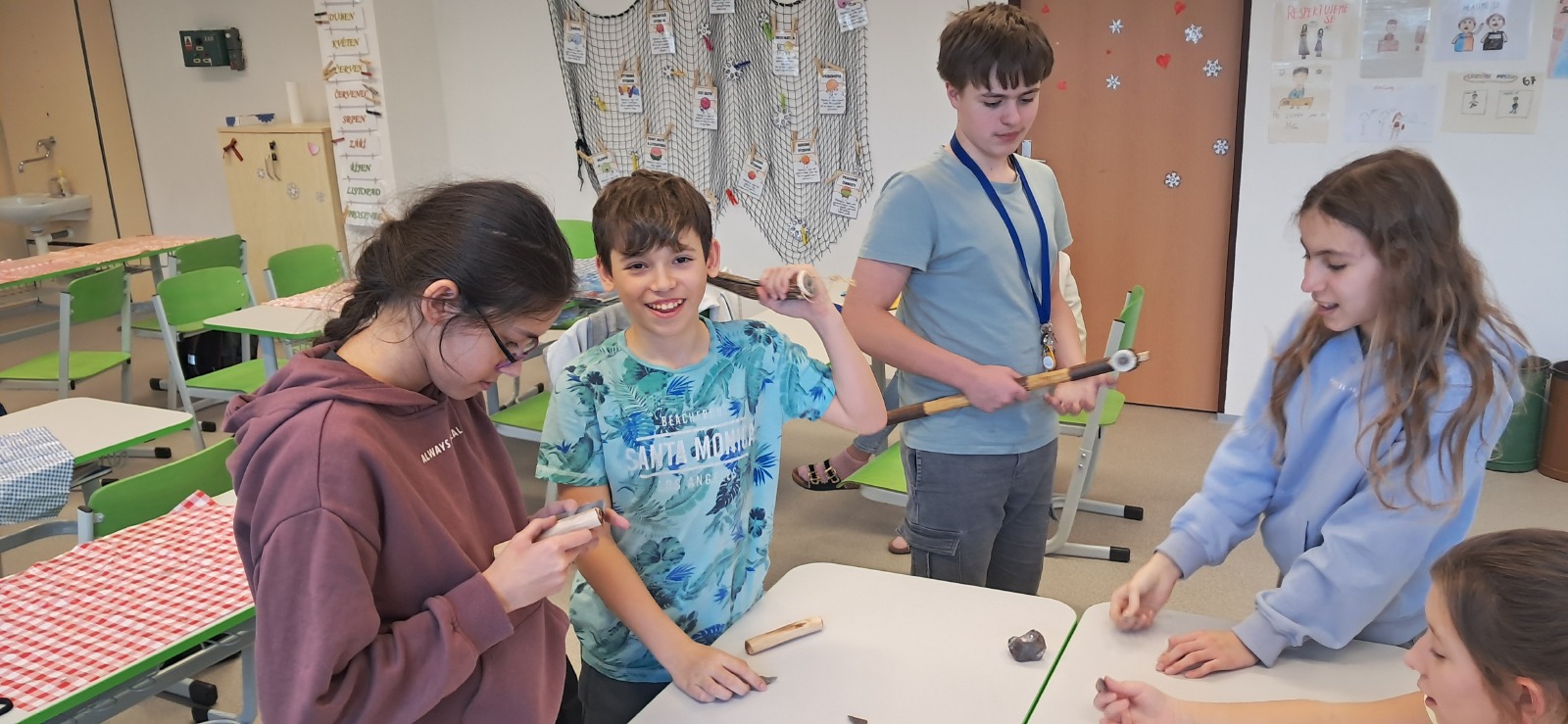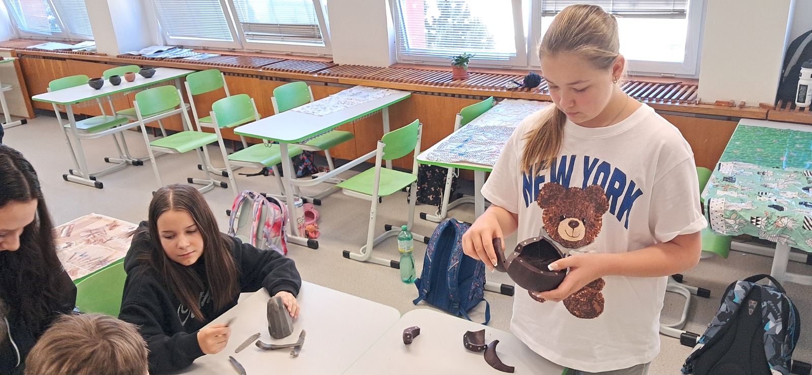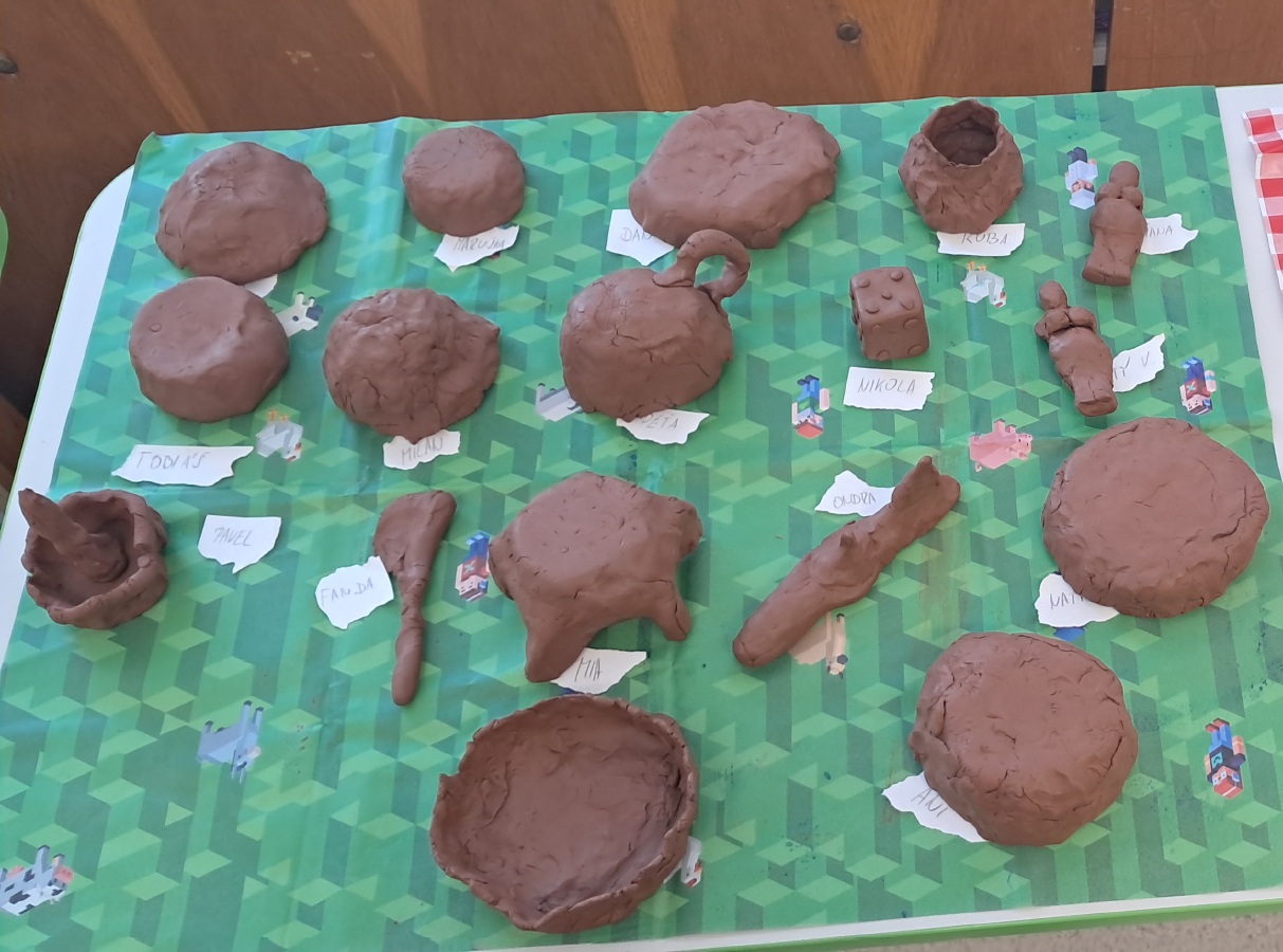 Nemohla chybět vlastní výroba keramické nádoby či jiného předmětu z pravěku. Jako inspiraci mohli žáci využit celou řadu předmětů, které paní edukátorka s sebou přivezla z muzea, od kopií misek a nádob, přes pazourek, hrot šípu, pilku po srp nebo sekeru.