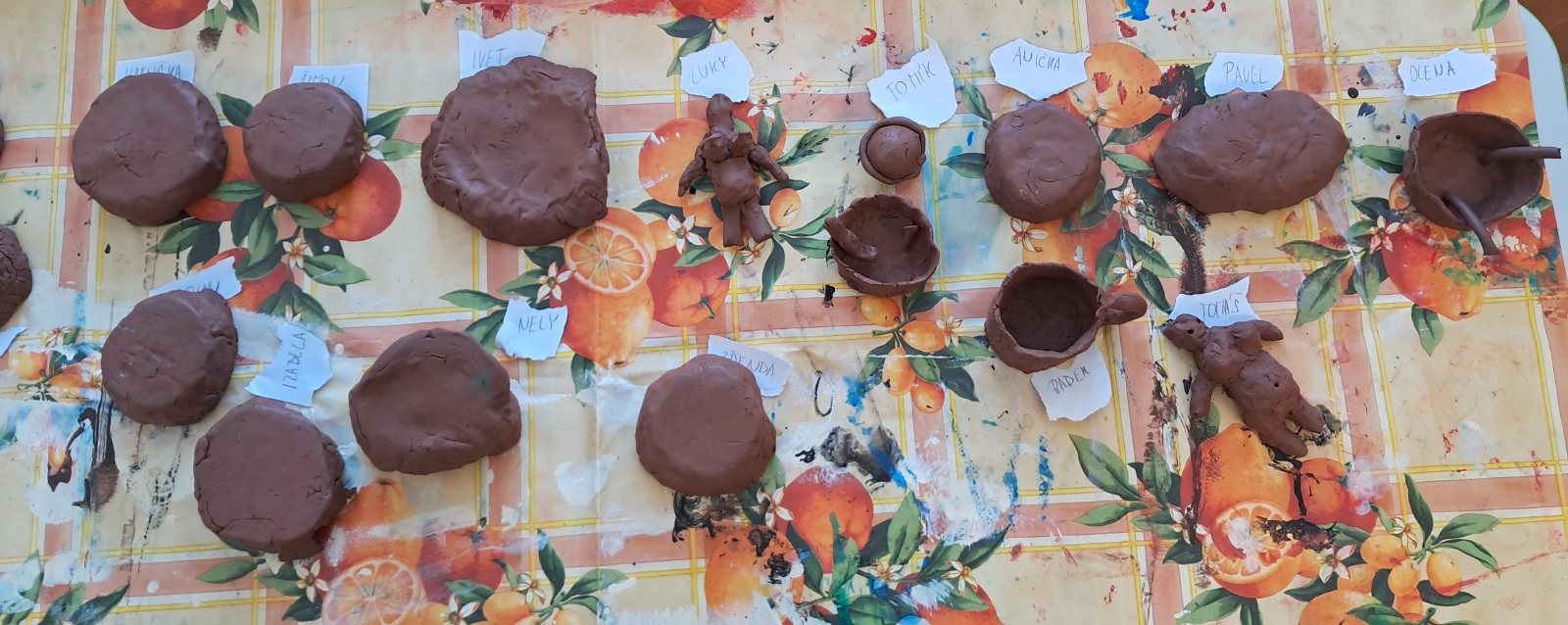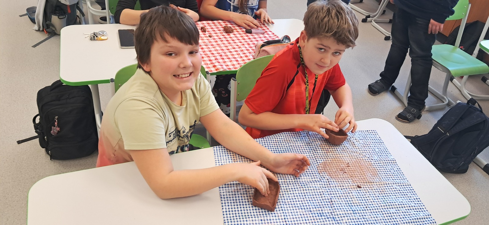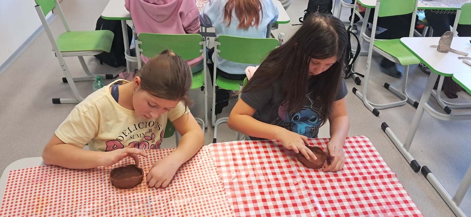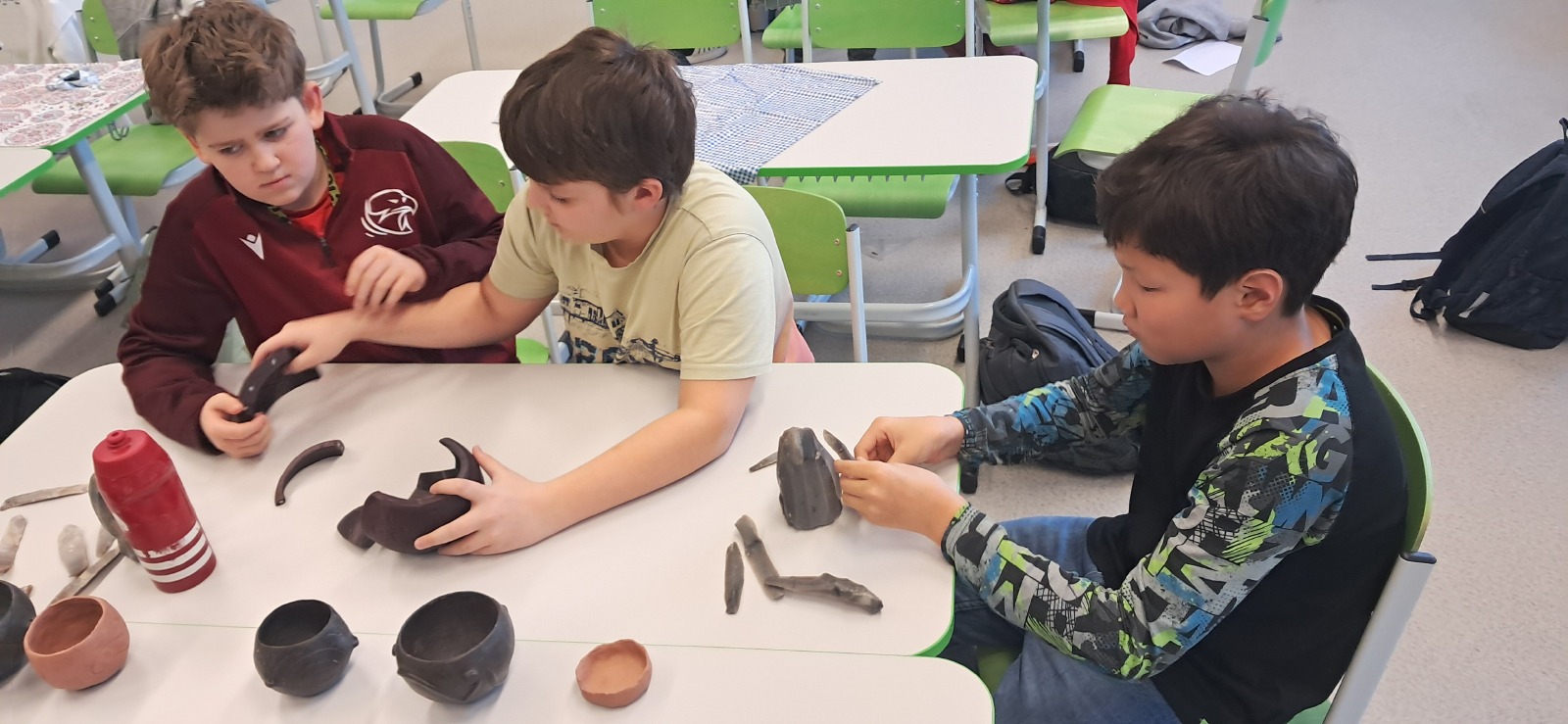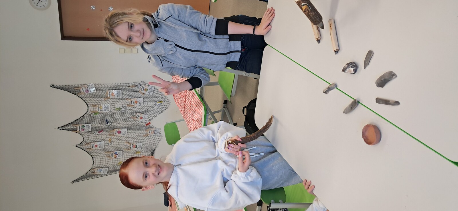 Nemohla chybět vlastní výroba keramické nádoby či jiného předmětu z pravěku. Jako inspiraci mohli žáci využit celou řadu předmětů, které paní edukátorka s sebou přivezla z muzea, od kopií misek a nádob, přes pazourek, hrot šípu, pilku po srp nebo sekeru.