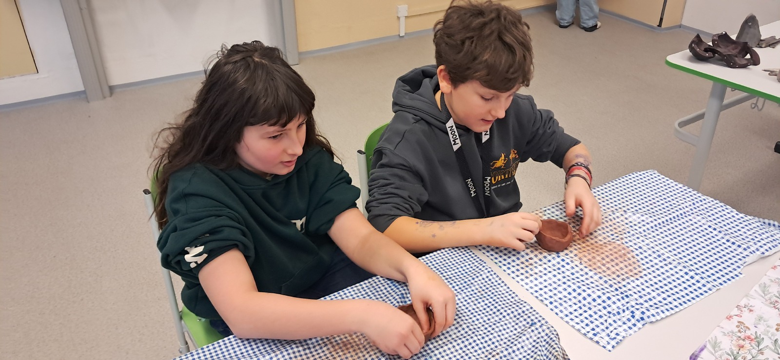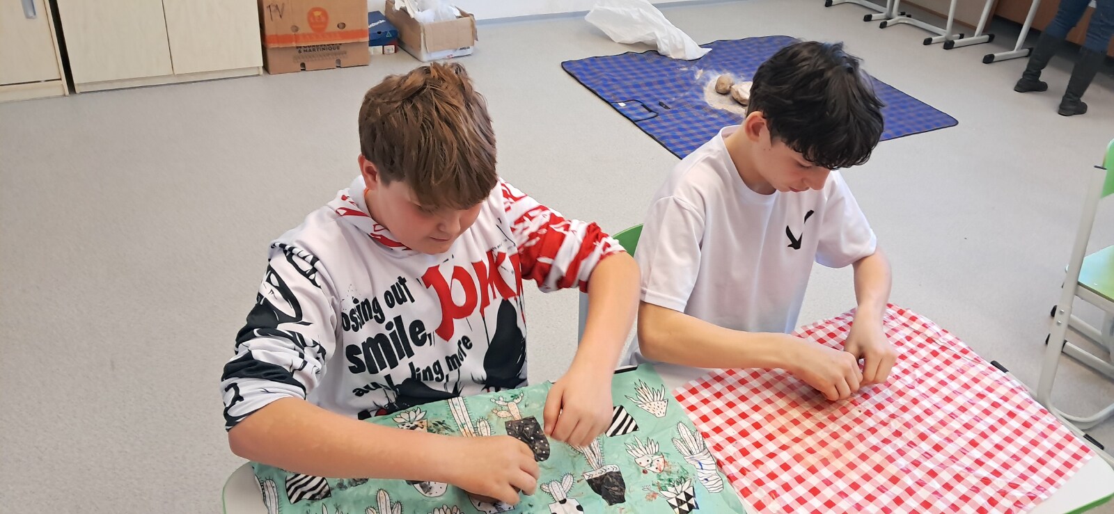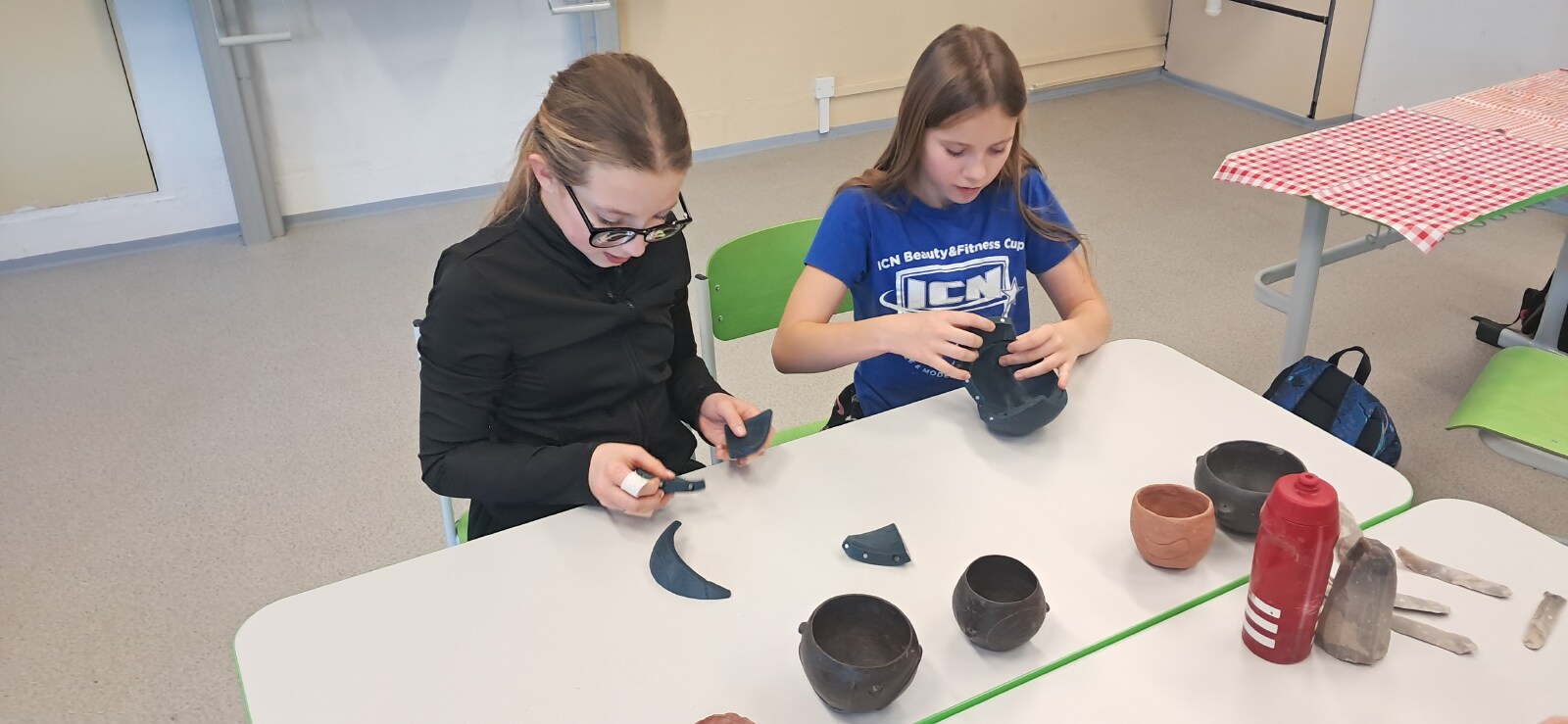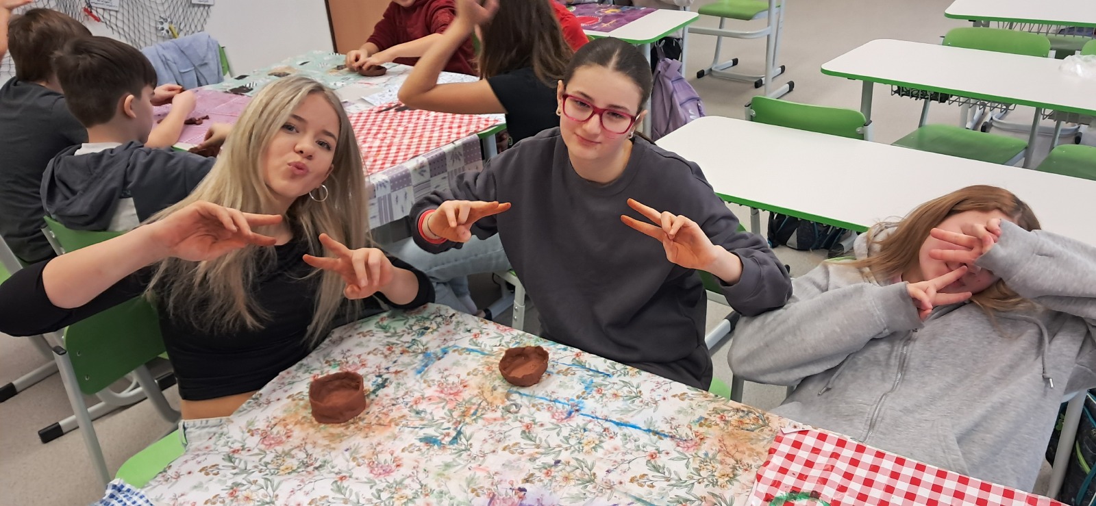 Nemohla chybět vlastní výroba keramické nádoby či jiného předmětu z pravěku. Jako inspiraci mohli žáci využit celou řadu předmětů, které paní edukátorka s sebou přivezla z muzea, od kopií misek a nádob, přes pazourek, hrot šípu, pilku po srp nebo sekeru.