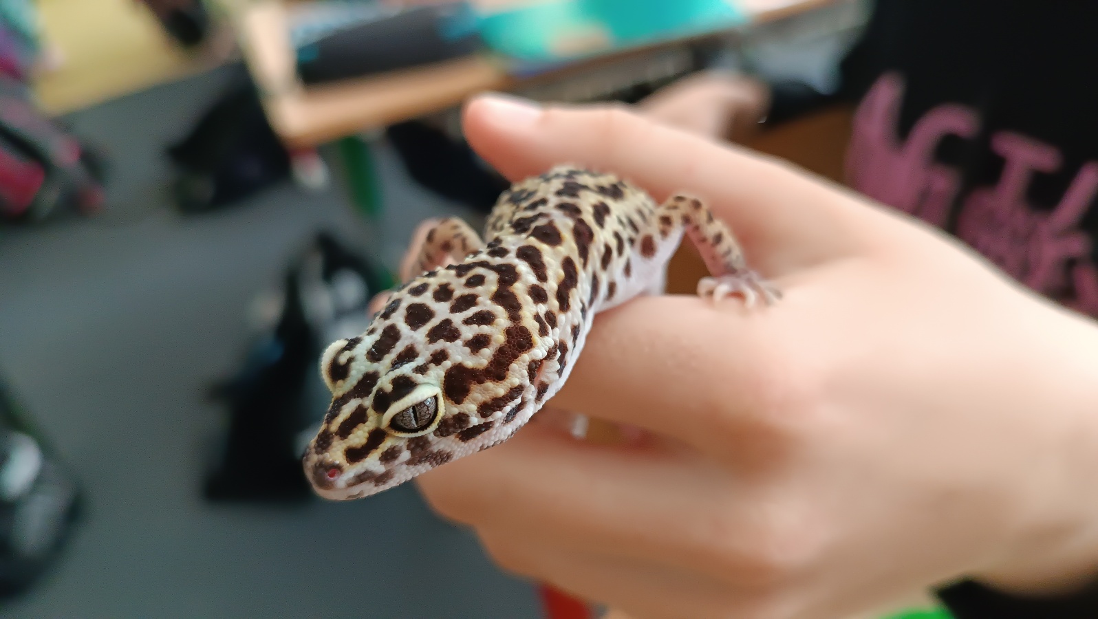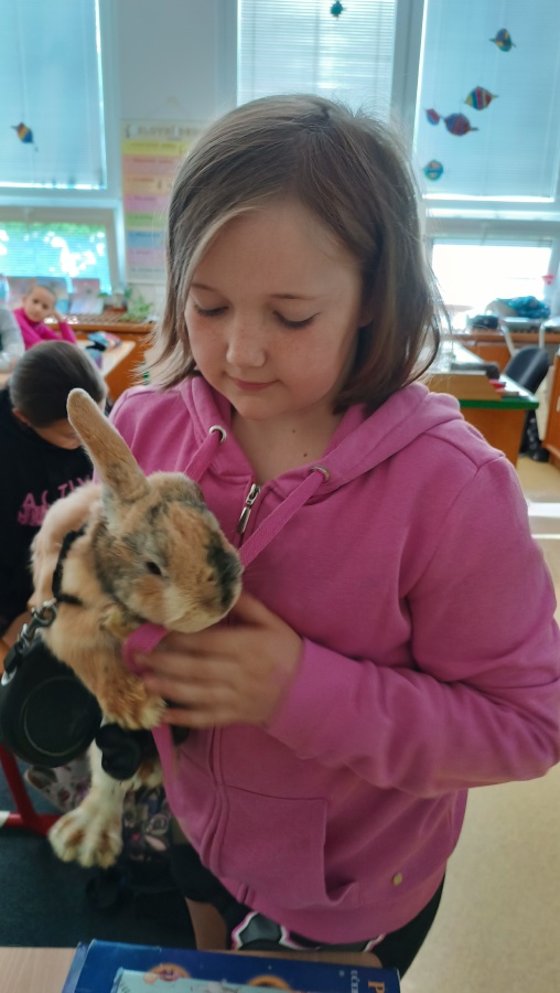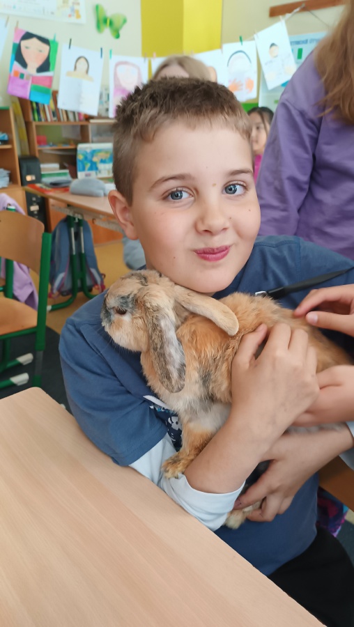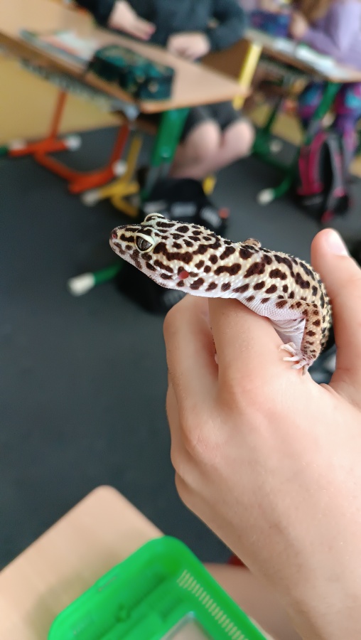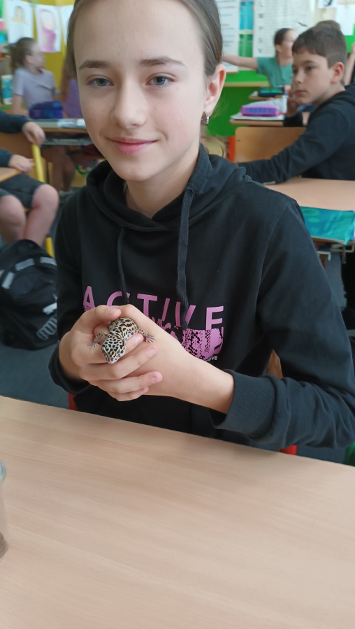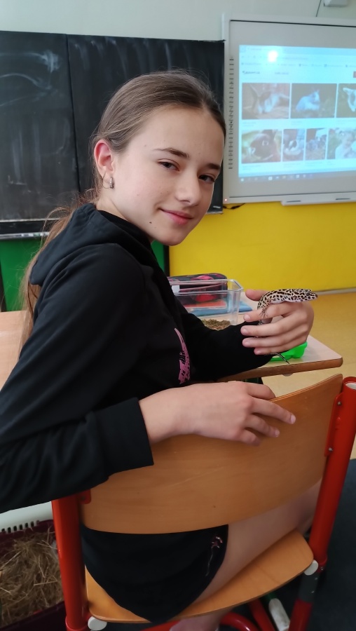 Úterní hodina přírodovědy ve třídě 5.B byla mimořádně zajímavá a zábavná. Dvě děvčata z naší třídy nás překvapila návštěvou svých domácích mazlíčků – zakrslého králíka a gekončíka nočního.
