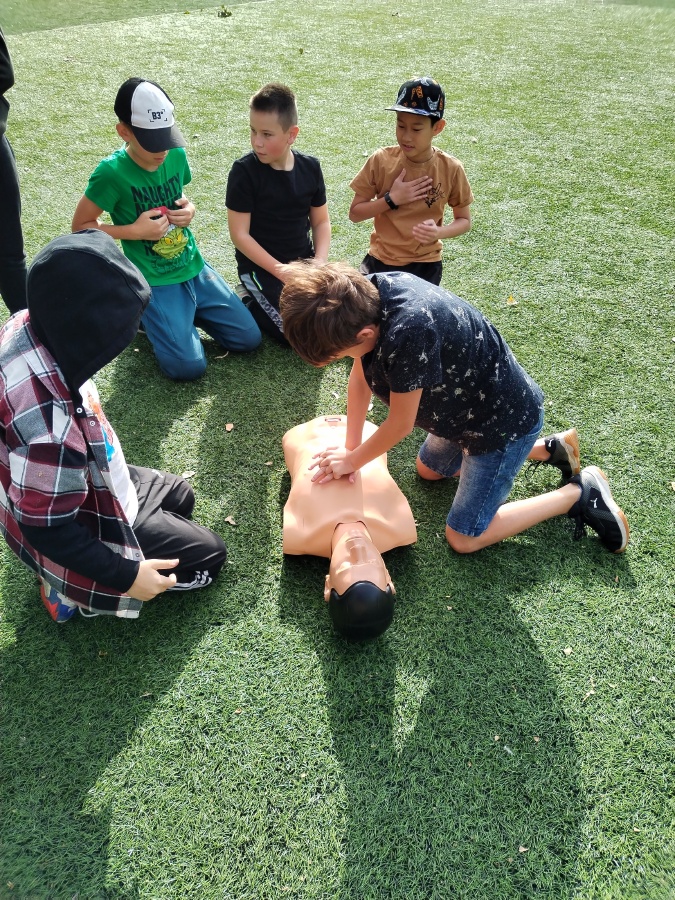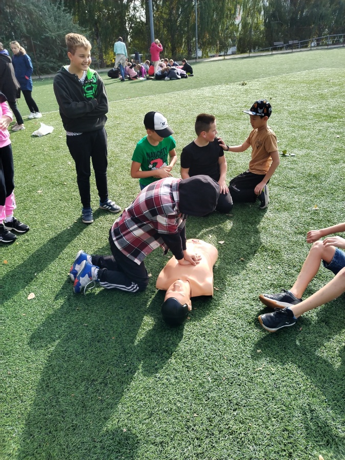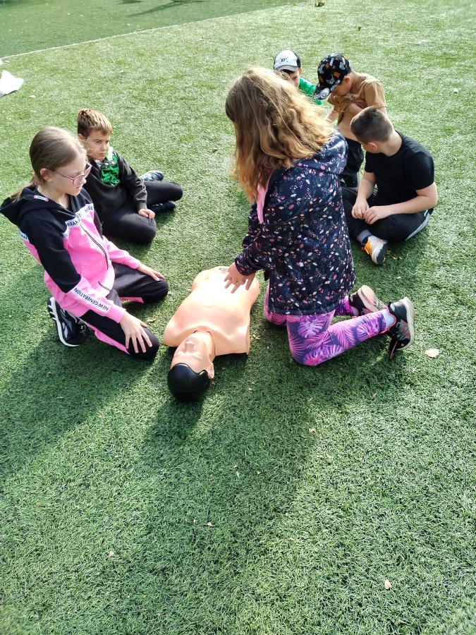 Po návratu do třídy jsme si pustili kurz první pomoci od pravého záchranáře M. Dvořáka, který létá s helikoptérou ZS. Další část dne jsme trávili venku, kde jsme si vyzkoušeli první pomoc na figuríně, opakovali si dopravní výchovu, topografii a také co patří do evakuačního zavazadla.