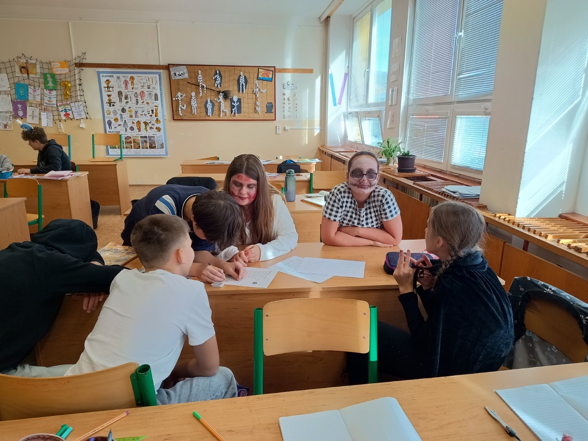 Také v 7.B se 31. října slavil svátek Halloween. Žáci začali s přípravou již den předem, kdy si upekli sušenky se strašidelnou tématikou při pracovních činnostech. V pátek si v hodině angličtiny zopakovali haloweenská slovíčka, skládali věty, luštili a doplňovali slovíčka do příběhu O vystrašené černé kočce. V hudební výchově si děti zazpívali úvodní píseň ze seriálu Adamsova rodina, jak jinak než v originále. Všechny kostýmy byly velmi povedené a do detailu promyšlené. Hororová postava Pennywise v podání Emy Čábelické byla odměněna prvním místem. Jak to u nás probíhalo, si prohlédněte ve fotogalerii.