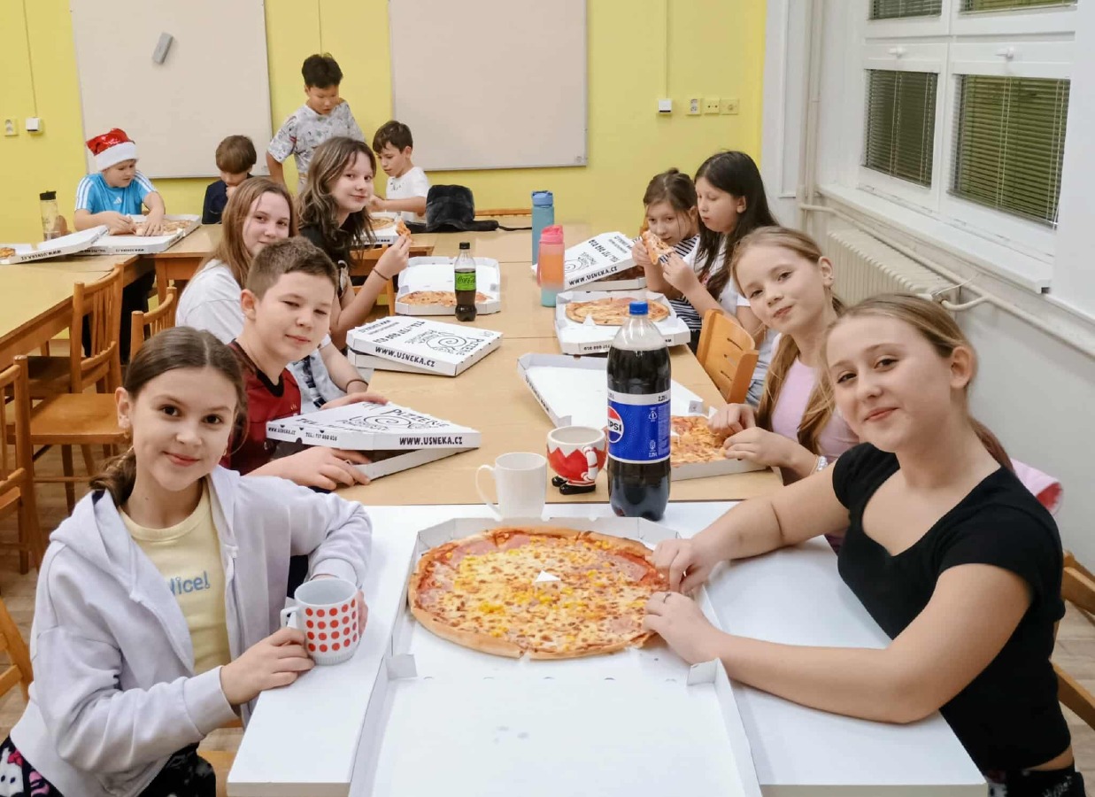 Poprvé jsme přespávali ve škole. Nejdříve jsme si třídu proměnili na ložnici. Povečeřeli jsme pizzu. Část dětí se přesunula s paní učitelkou Švejnohovou do kuchyňky, kde nám připravovaly dobroty na snídaní, ovocný koláč, bábovku, trdelníky a muffiny. "Moc děkujeme, bylo to vynikající!" Početnější skupina dětí sportovala a fandila v tělocvičně. Večer jsme si užili diskotéku. Oslavili jsme narozeniny naší spolužačky. A na dobrou noc nám paní učitelka četla z knihy Pekelná třída.