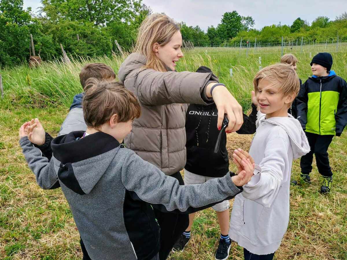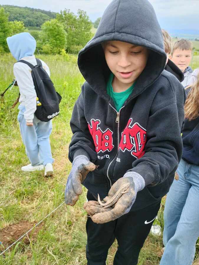 Ráno jsme se sešli s paní lektorkou a vinařem Jiřím Kociánem na smluveném místě za Kutnou Horou a společně jsme zamířili na vinici. Vinařský program se skládal ze dvou částí – poznávací hry a sázení sazenic vína. Při poznávací hře děti hledaly 6 kartiček a zapisovaly si nalezené obrázky do pracovních listů, kde luštily tajenku. Povídaly si o podmínkách pěstování vína, ale i o plošných mírách, zkoušely vymezit metr čtvereční. S panem vinařem si připomněly zvířata, která se mohou objevit na vinici: brouci švižníci a tesaříci, pavouci, žížaly, škvoři, mravenci, ještěrky, hraboši, puštík, káně, poštolka…