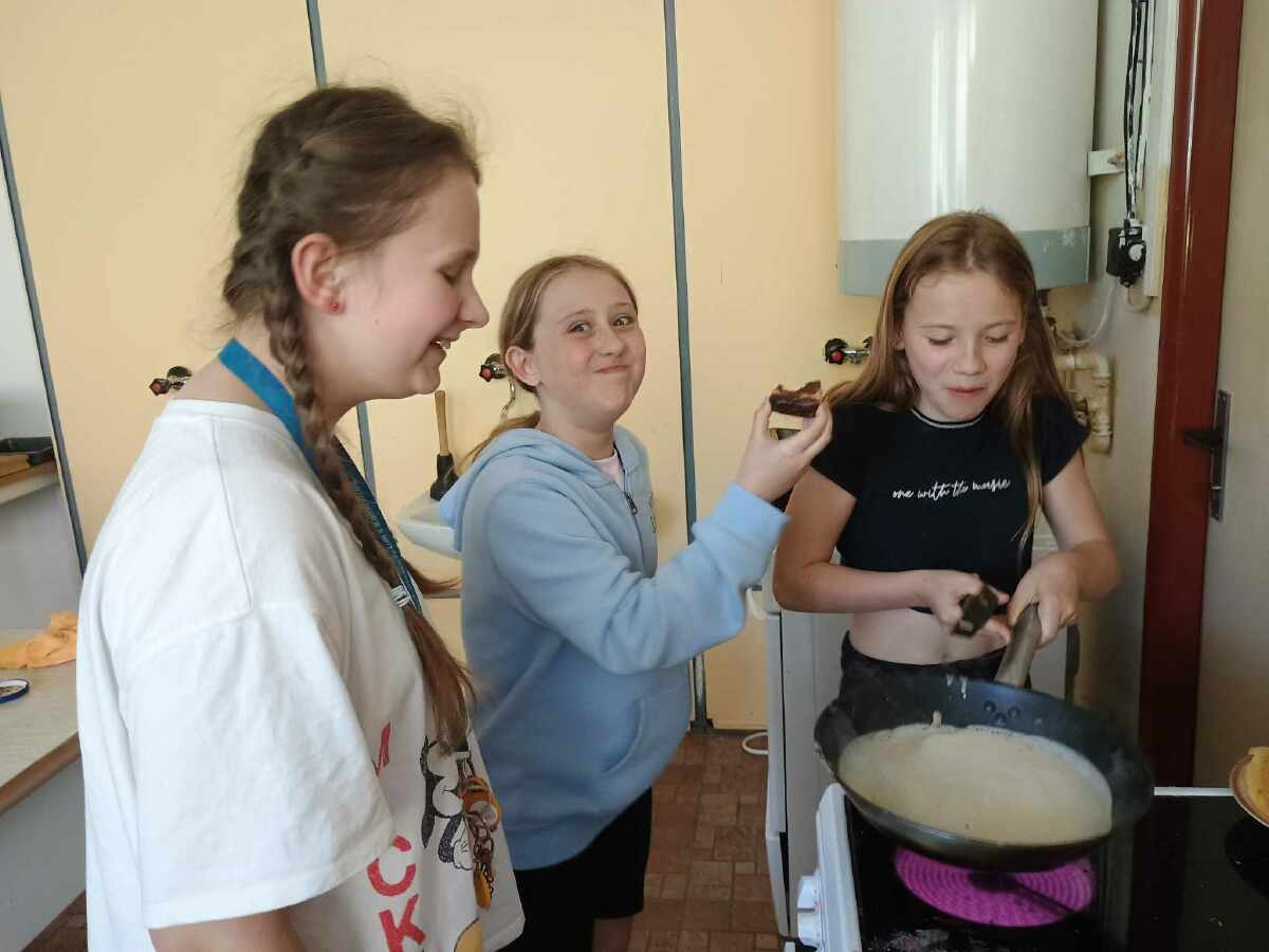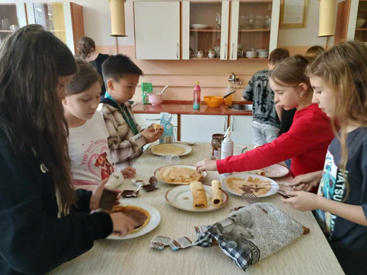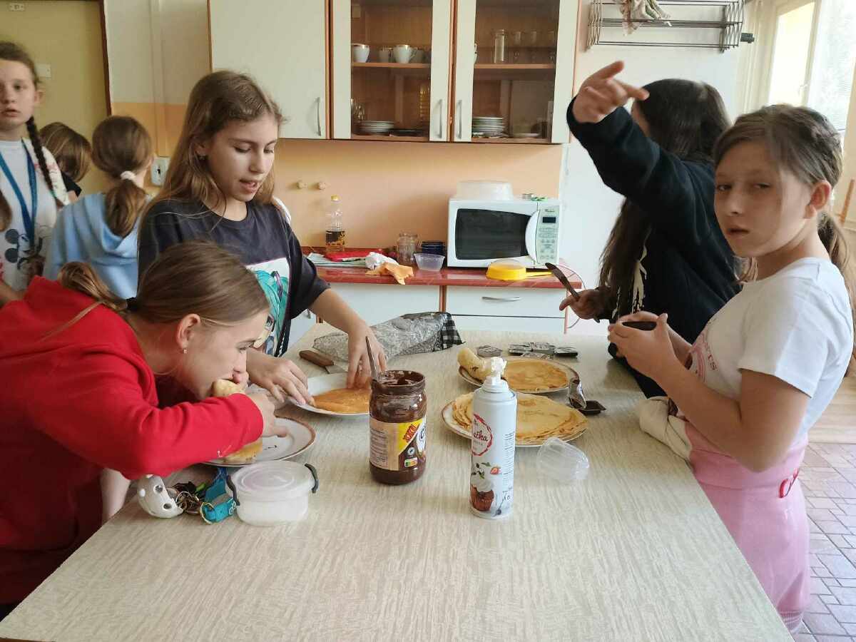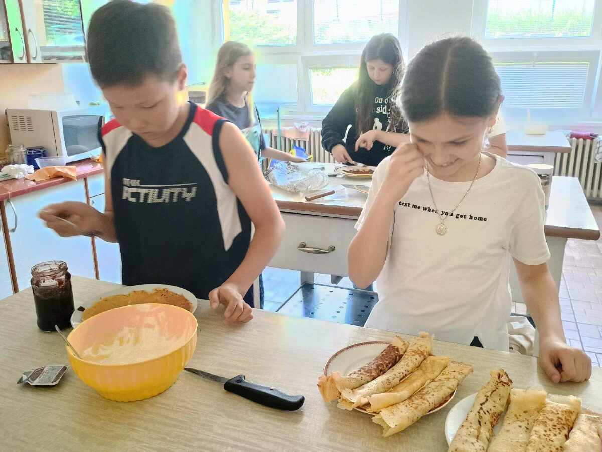V úterý 29.4. jsme si byli vyzkoušet ve školní kuchyňce, v rámci praktické výuky popisu pracovního postupu, jak si připravit palačinky. Rozdělili jsme se do 4 skupin a podle receptu z kuchařské knihy jsme se pustili do práce. Odměna byla zasloužená a sladká - s marmeládou, ovocem, nutellou i šlehačkou! ![]()