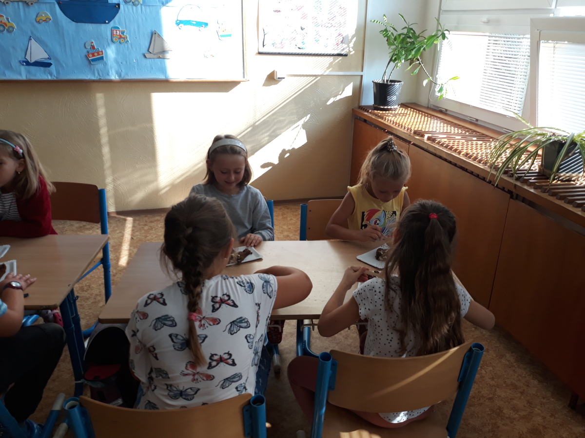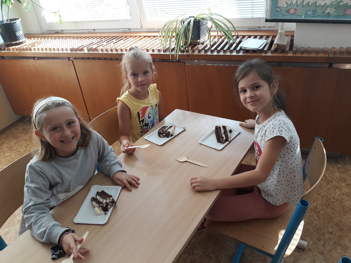 Dnešní hodina pracovních činností proběhla trochu jinak než obvykle. Jedna naše spolužačka slavila narozeniny. Při přípravě oslavy jsme si zopakovali, jak se prostírá, jak se chováme u stolu. Vše jsme si také hned vyzkoušeli. Spolužačce jsme popřáli, pochutnali jsme si na výborném dortu a vše po sobě také uklidili. Moc se nám to líbilo.