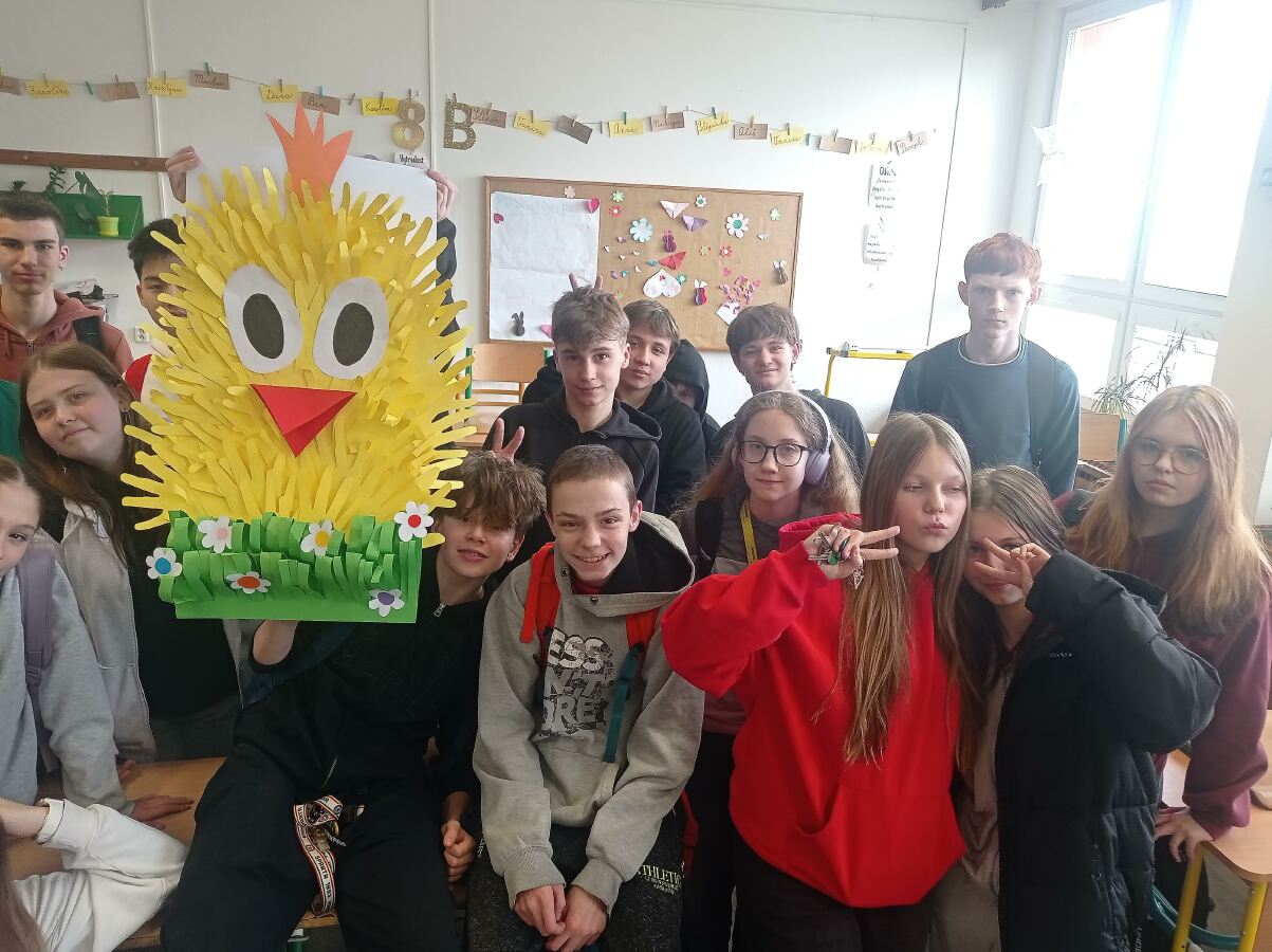 Na Velikonoce si žáci 8.B vyzdobili dveře své třídy krásnou společnou velikonoční dekorací. Každý přispěl k tomu, aby se "narodilo" roztomilé velikonoční kuřátko.