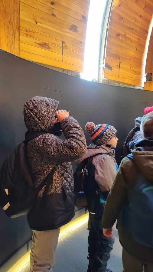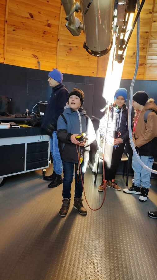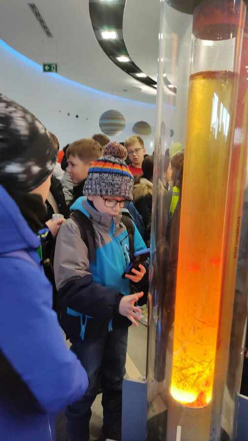 V přízemí budovy planetária jsme si mohli prohlédnout interaktivní expozici Mikrosvět - makrosvět, v patře výstavu Energie - její formy a přeměny, ve foyer modely planet, ve vstupní hale hvězdárny stálou výstavu o astronomii a kosmonautice. V kupoli hvězdárny s dalekohledem jsme pozorovali Slunce a sluneční skvrny. Než jsme se vrátili zpět do haly hvězdárny, abychom si koupili nějaké upomínkové předměty, Maty si vyzkoušel, jak se zavírá střecha observatoře.![]()