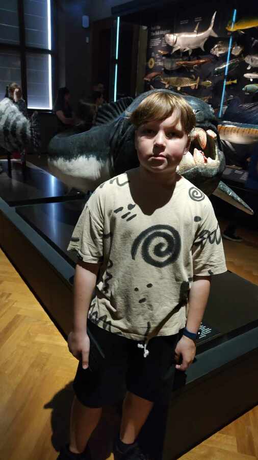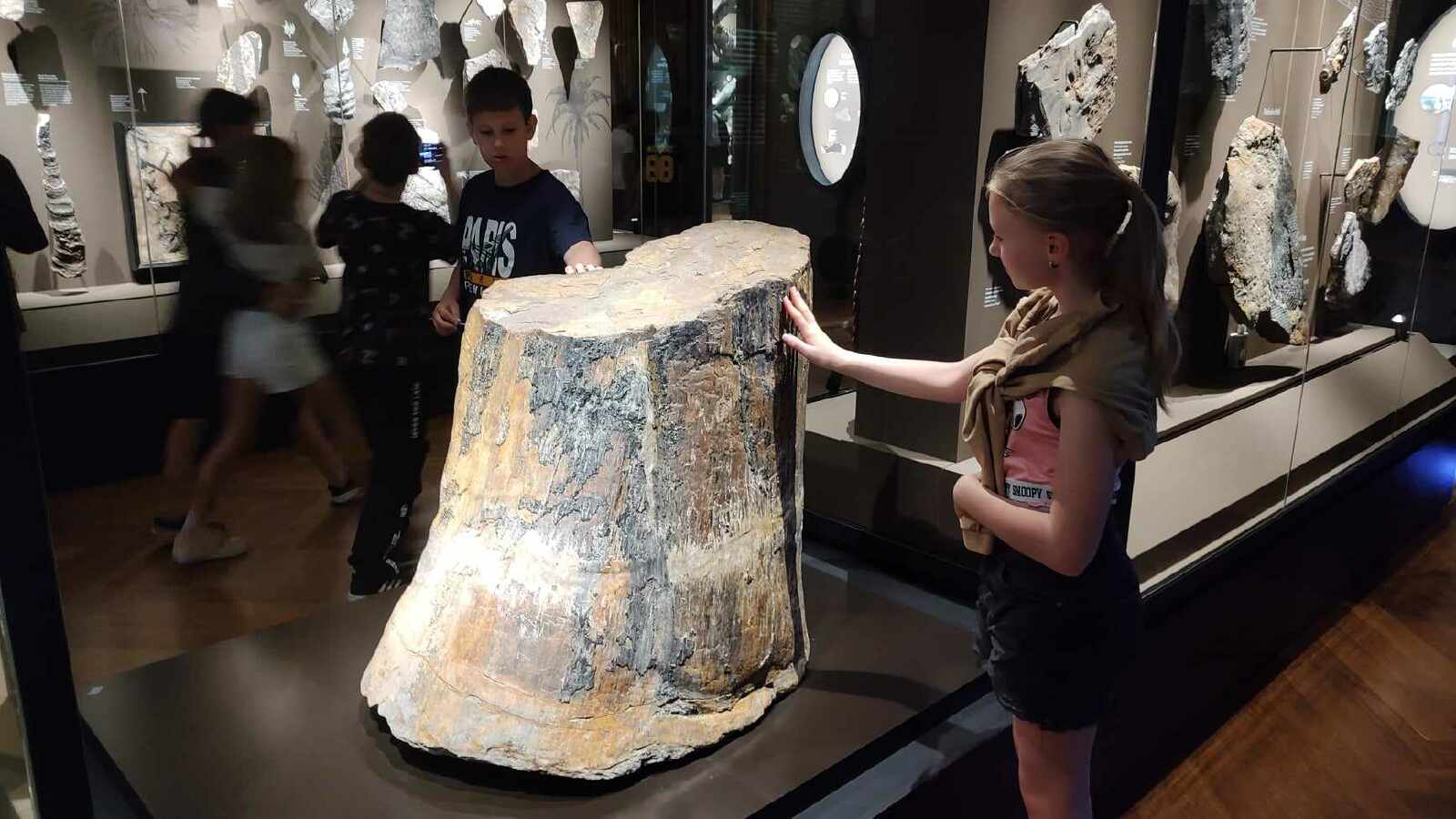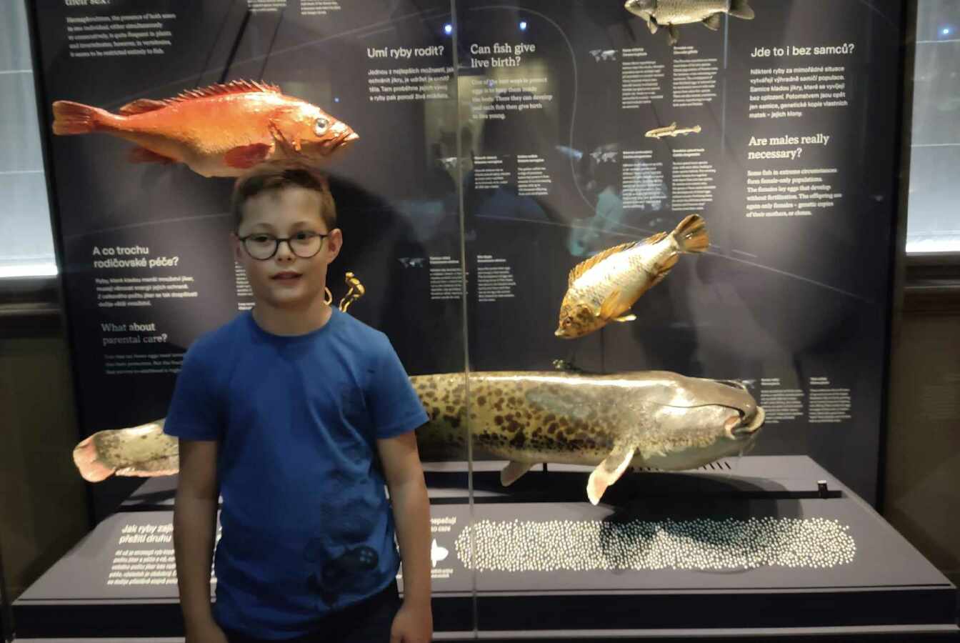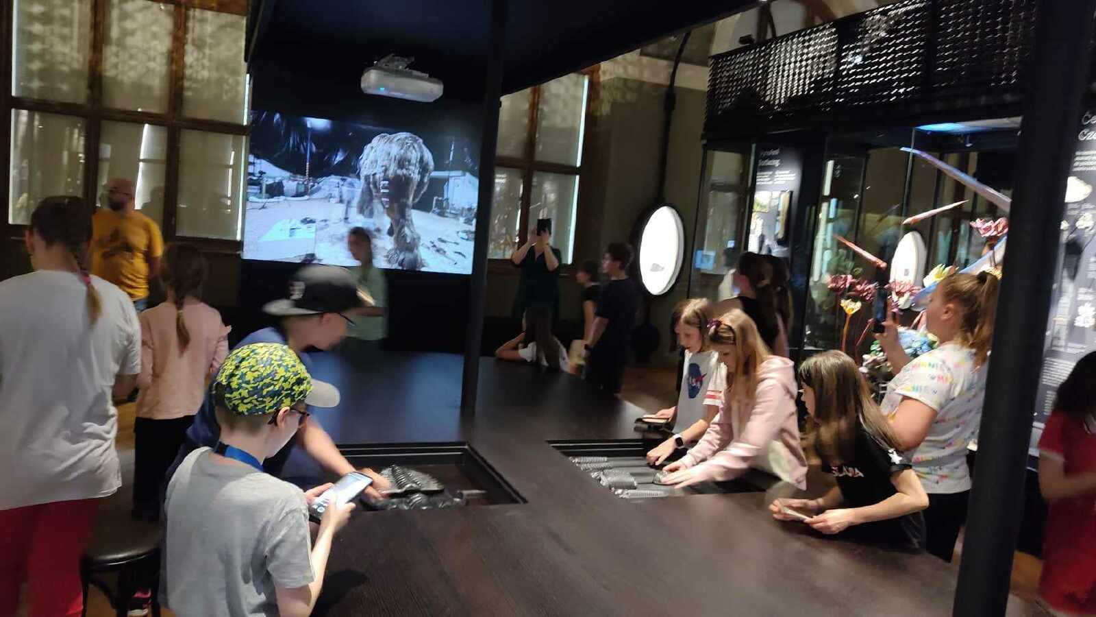 Prohlídku jsme začali v prvním patře expozicí Okna do pravěku, prošli jsme se historií planety Země od prvohor až po čtvrtohory, viděli jsme mnoho zajímavých exponátů, od trilobitů po mamuta srstnatého, nosorožce srstnatého, býložravého medvěda jeskynního.