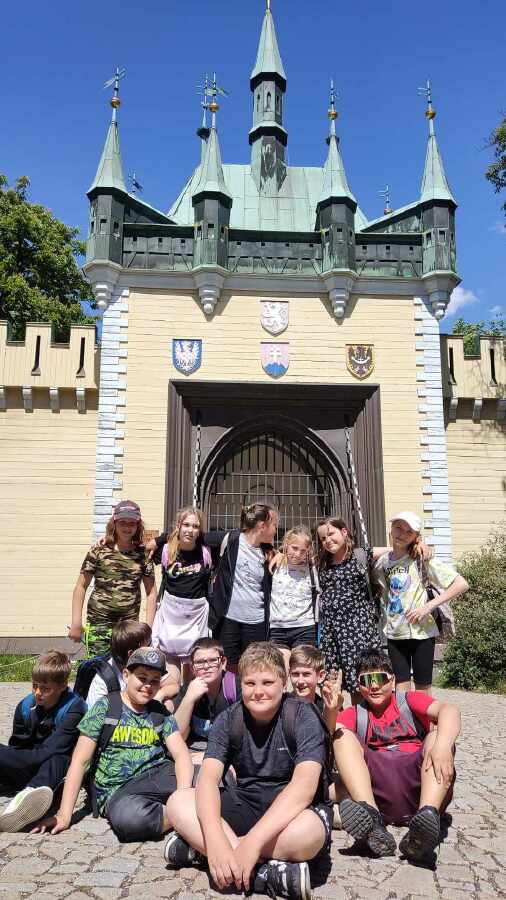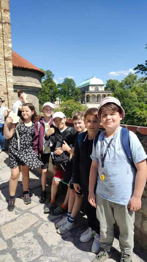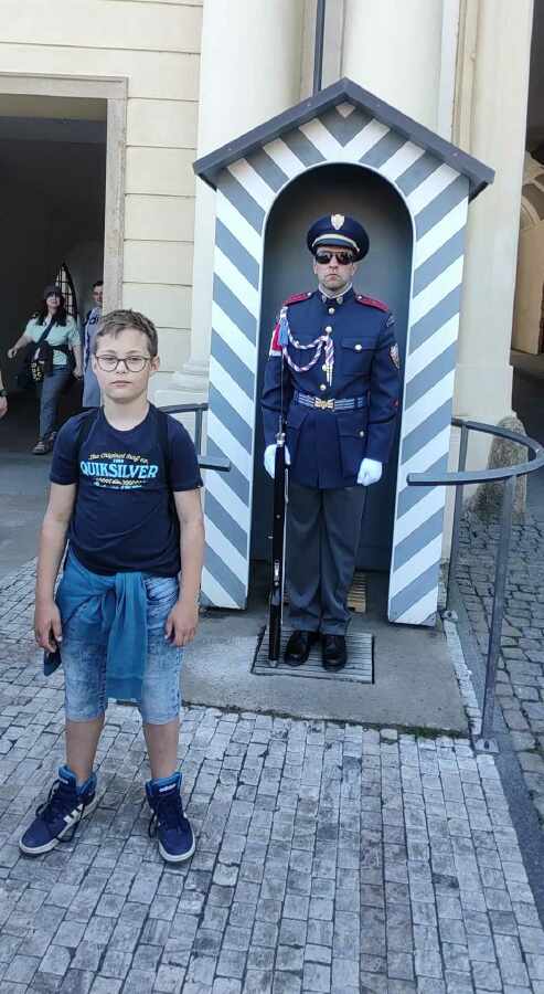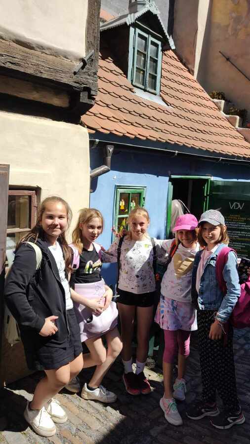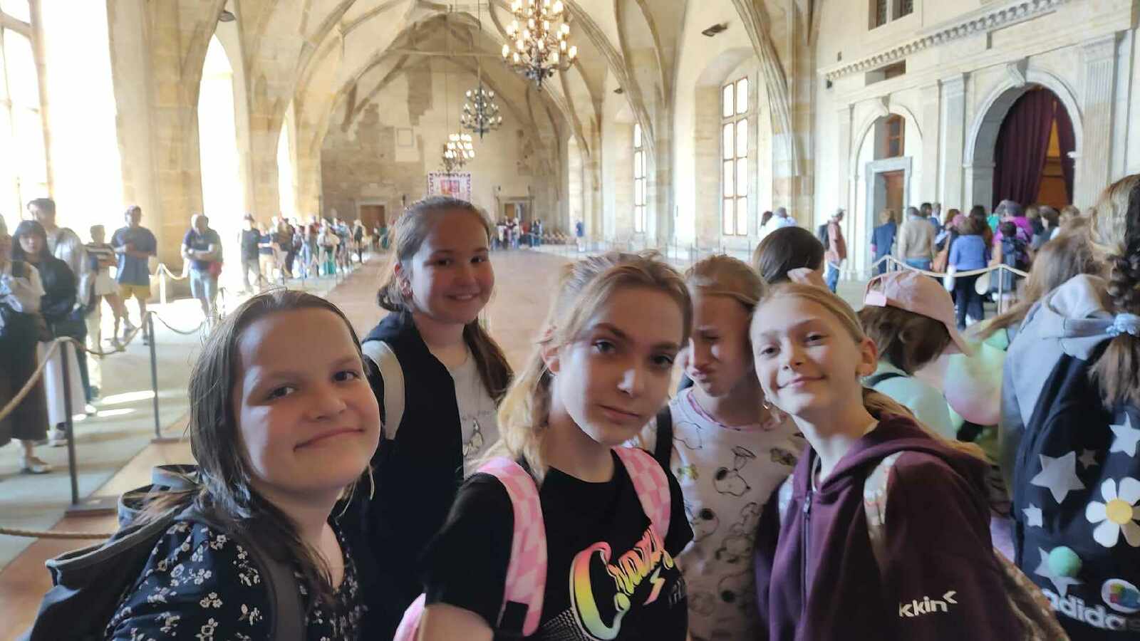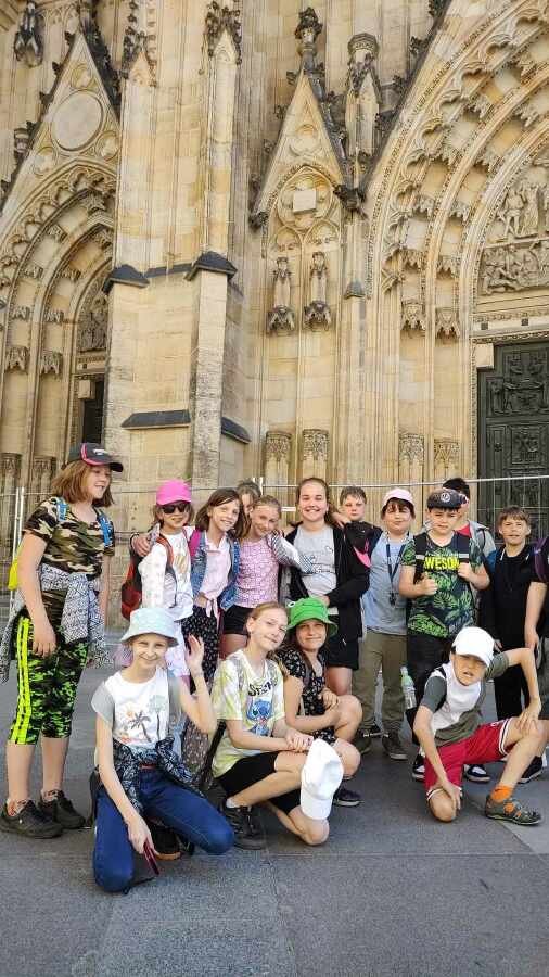 Na třetím nádvoří jsme se zastavili u mramorového jehlanu, památníku obětem 1. světové války, u kopie středověké sochy sv. Jiří bojujícího s drakem. Ukázali jsme si, kde se nacházejí prezidentské kanceláře. Ve Starém královském paláci jsme si prohlédli rozlehlý Vladislavský sál a repliky korunovačních klenot. V bazilice sv. Jiří jsme viděli náhrobky členů knížecího rodu Přemyslovců, Vratislava I. a sv. Ludmily. Ve Zlaté uličce jsme obdivovali miniaturní domečky hradních střelců, dnes turistické obchůdky. Prohlídkový okruh jsme zakončili u legendární věže Daliborky s výhledem na renesanční letohrádek královny Anny (Jagellonské), který nechal postavit Ferdinand I. Habsburský své milované ženě. Celé dopoledne nám zpříjemňovala svým zajímavým výkladem paní učitelka Brabcová.