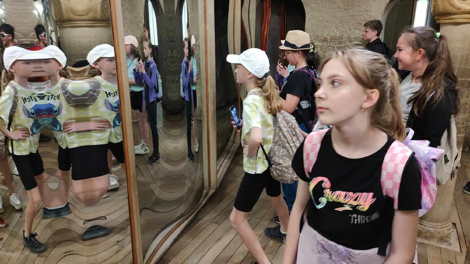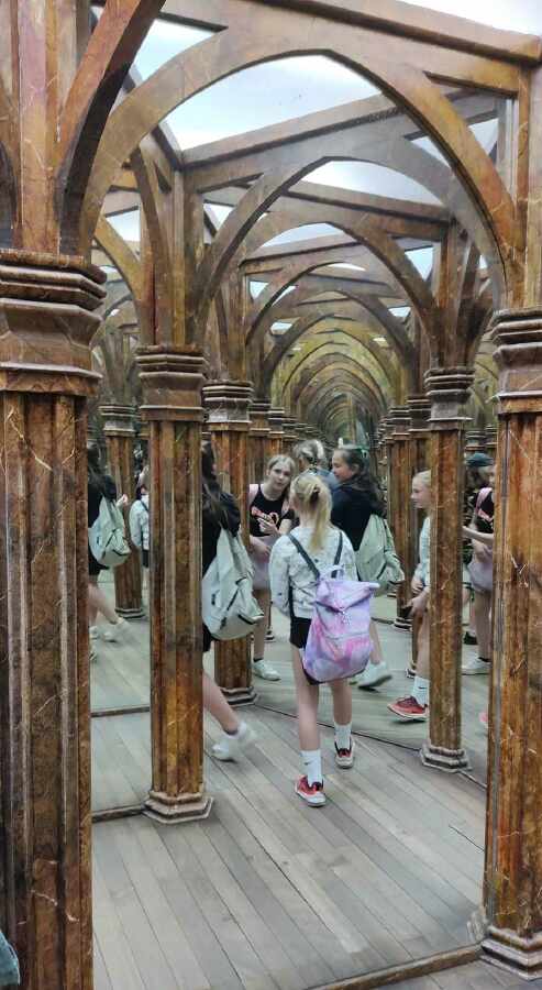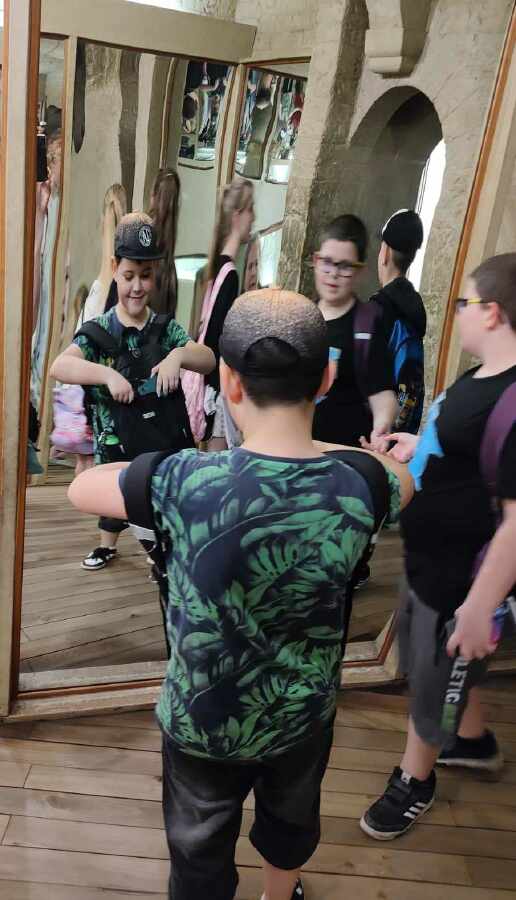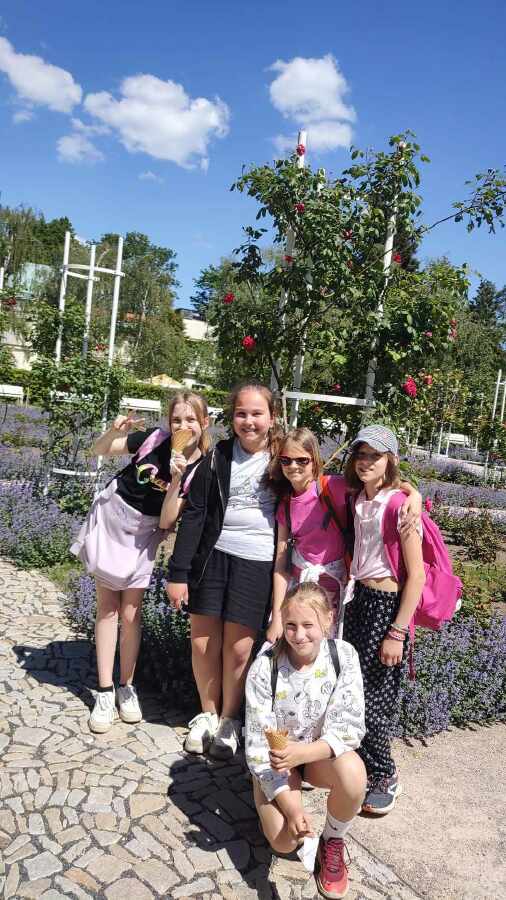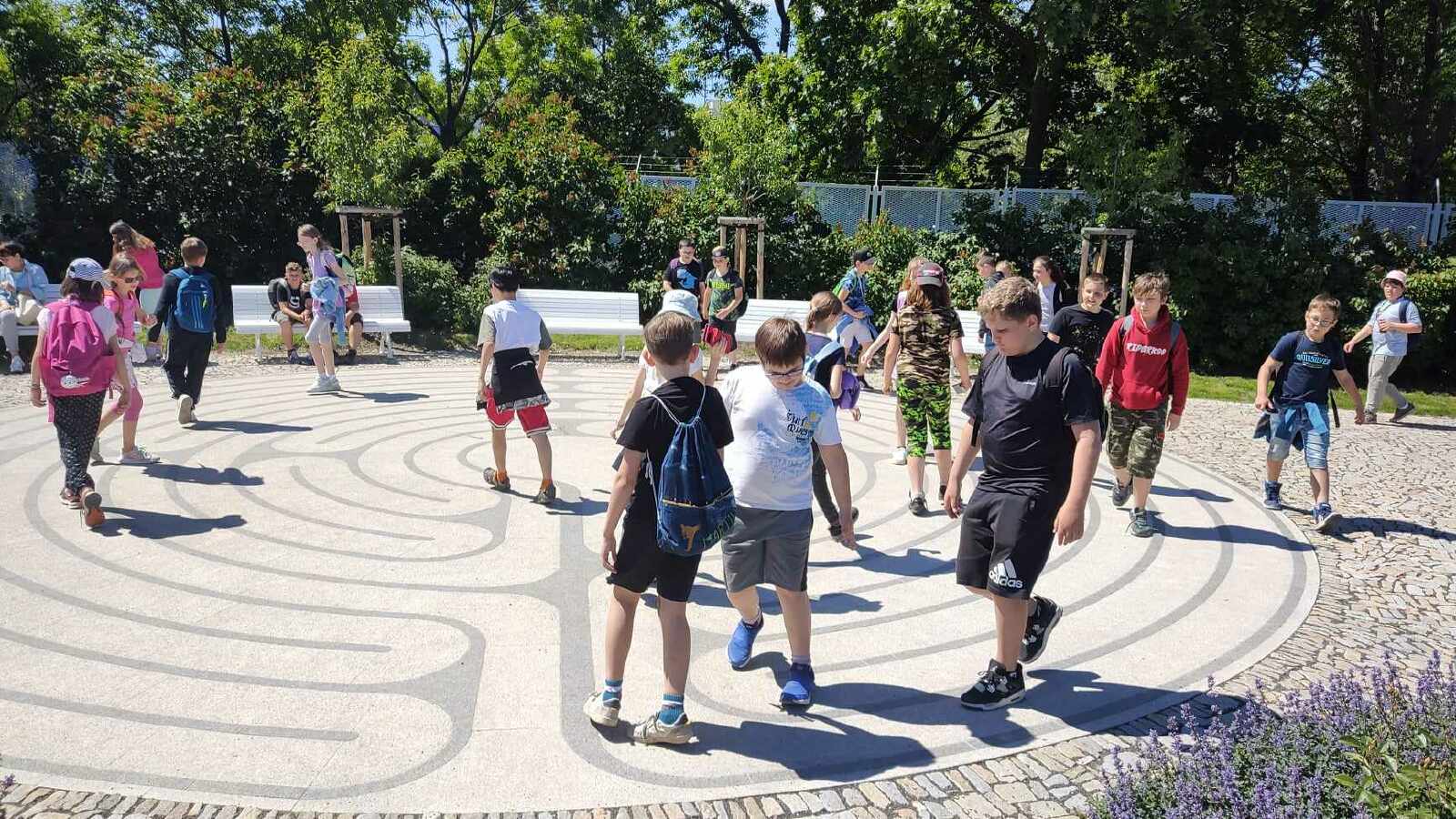 Na Petříně jsme se nejprve svezli lanovkou a potom jsme se rozdělili do dvou skupin – jedni zdolali 299 schodů a z petřínské rozhledny shlíželi na Prahu, druzí se vrhli do zrcadlového bludiště a bavili se před zakřivenými zrcadly. Prošli jsme si krásnou růžovou zahradu, vypletli jsme se z labyrintu, tentokrát jen nakresleného na zemi, a vyrazili jsme k domovu. Na zpáteční cestě jsme se ještě posilnili v restauraci McDonalds.