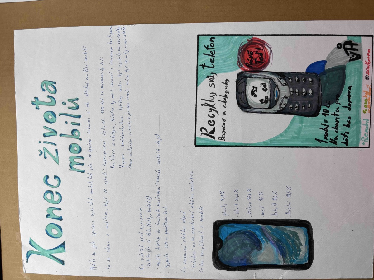 Třída 7.C si u příležitosti Dne Země pracovala na projektu na téma „Mobilní telefon a jeho " život“. Žáci pracovali ve čtyřech skupinách. Skupina „Zrození mobilu“ zkoumala suroviny, místa těžby i pracovní podmínky a vytvořila mapu světa s cestou mobilu od dolu k uživateli. Skupina „Co je uvnitř?“ se věnovala složení telefonu a připravila technický plakát. K dispozici měla starý mobil, který si rozebrala. Skupina „Dopad na planetu“ analyzovala ekologické a sociální dopady a vytvořila infografiku doplněnou třídním průzkumem. Skupina „Konec života mobilu“ se zaměřila na recyklaci a elektroodpad a navrhla motivační plakát. Součástí projektu bylo i mapování okolí školy, kde žáci vyhledávali kontejnery a sběrná místa pro elektrozařízení. Výsledky zpracovali do mapy. Projekt žákům pomohl lépe pochopit dopad technologií na planetu i společnost.