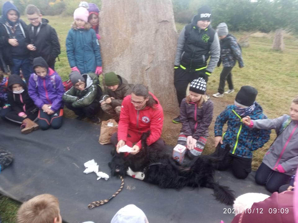 Dne 12.10.2021 proběhl na naší škole Branný den. Všechny třídy se po vyhlášení poplachu shromáždily na prostranství nedaleko školy a poté se odebraly splnit svůj pracovní plán. 5. ročníky si naplánovaly pochod na nedaleké Menhiry, kde na nás čekal psovod se svou canisterapeutickou fenkou Frejou, která nám dělala celé dopoledne milou společnost. Dozvěděli jsme se spoustu zajímavostí o pravidlech první pomoci nejen u lidí, ale i u zvířat. Fenka nás ohromila svoji trpělivostí a přítulností, a tak nás nechala, abychom si osobně vyzkoušeli, jak probíhá canisterapie. Děti se po Freje mohly naprosto s důvěrou poválet, nechala si od nás zavázat tlapky a někteří odvážlivci si nechali odejmout pamlsek přímo ze rtů. Počasí se vydařilo, i když sluníčko nás moc nezahřálo, ale nadšení dětí všechny tyto nesnáze dostatečně vynahradilo.