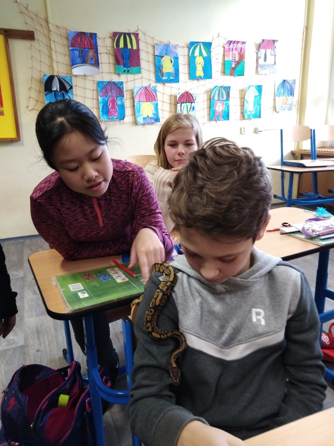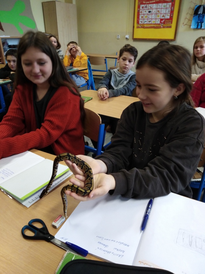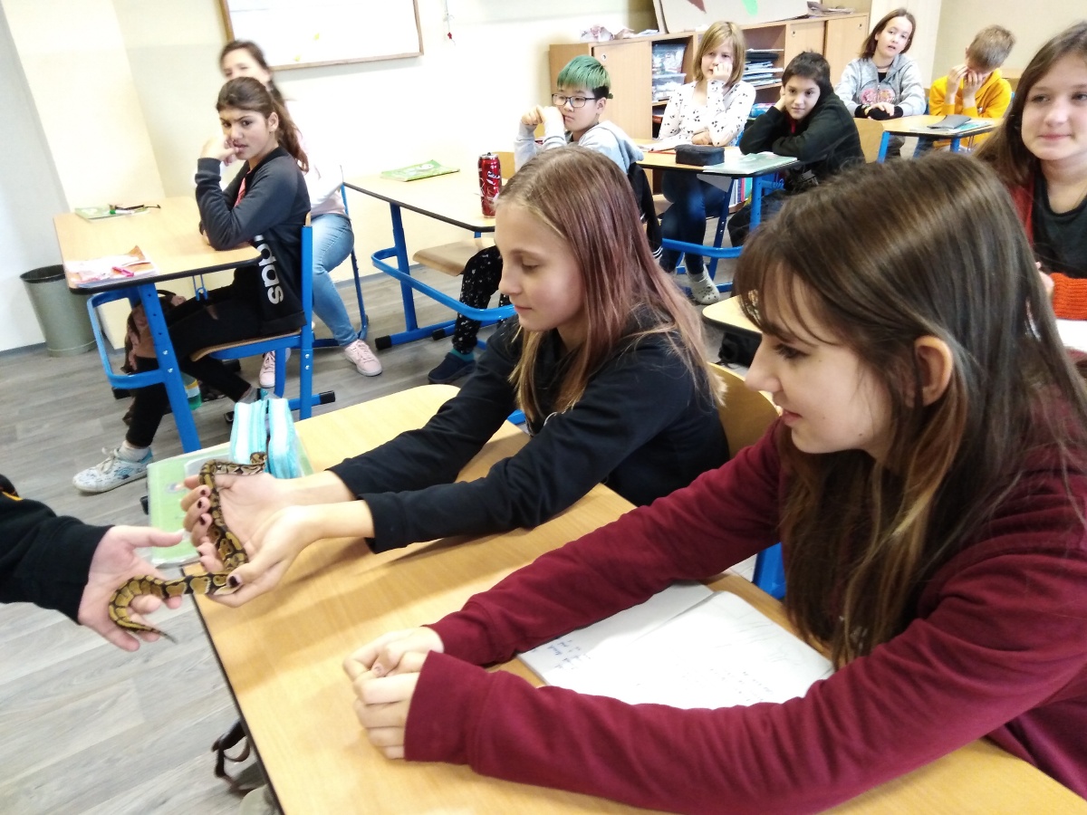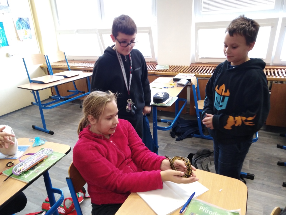 V hodině přírodopisu se žáci mohli setkat s dalším živým návštěvníkem. Tentokrát nás poctila návštěvou krajta královská, tedy v tomto případě zatím její menší verze – mládě Majkl. Dozvěděli jsme se o chovu cizokrajných hadů v domácích podmínkách a mnoho zajímavých informací o těchto plazech. Mnozí žáci s drobnými rozpaky a nedůvěrou sledovali zajímavou prezentaci, nakonec se však většina odhodlala přiblížit se do bezprostřední blízkosti a mnozí žáci si pak se svolením majitele Majkla vzali do svých rukou.