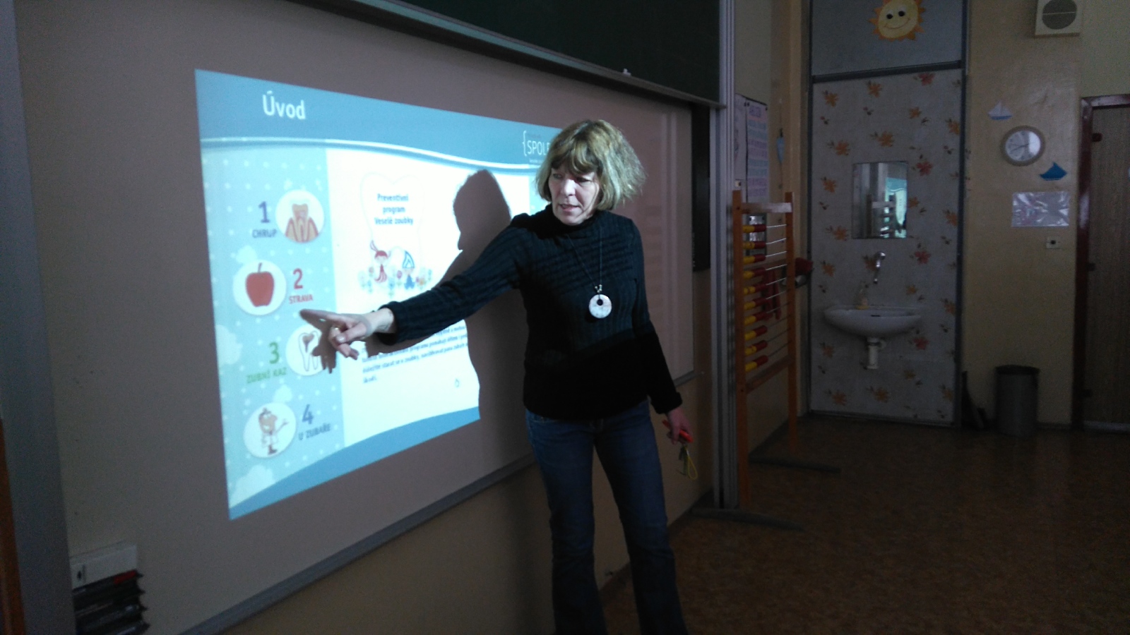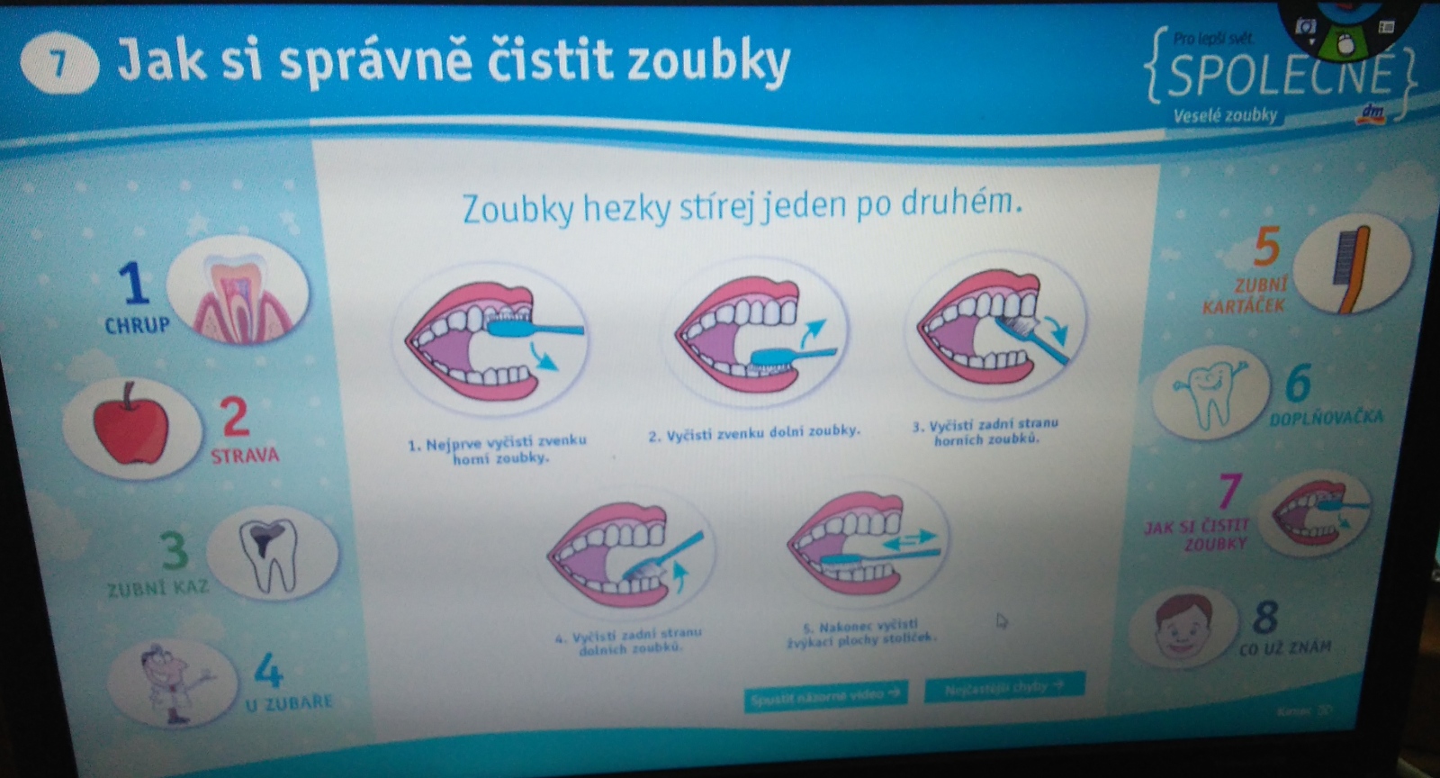 První část probíhala za pomoci interaktivní tabule. Děti se například dozvěděly, jak zoubek vypadá, z čeho se skládá, co je to zubní kaz, jak o zoubky pečovat, jak se chovat u zubaře. Dále následovaly kvízy, křížovky a nakonec je za odměnu čekala krátká pohádka o Hurvínkovi a jeho bolavém zoubku.