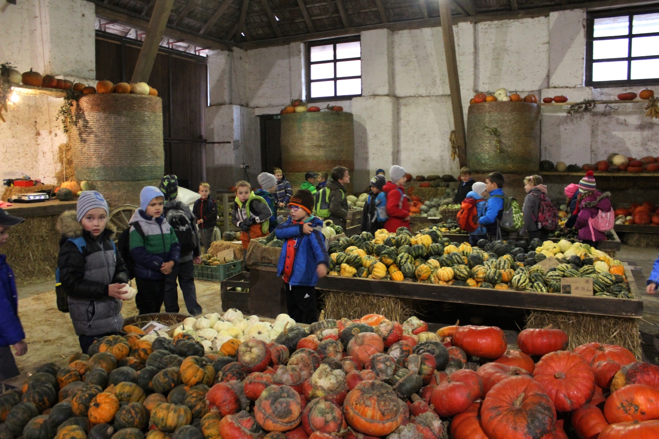 Prošli jsme stodolou plnou dýní různých tvarů a barev, některé jsem si zakoupili. Ochutnali jsme dobroty z dýní. Podívali jsme se na stavby z dýní a na to jaká zvířátka na statku žijí. Viděli jsme slepičky, husy, prasátko, telátko, kozy a malá kůzlátka, ovečky s jehňátky a nakonec i poníka. Vyřádili jsme se ve slámovém bazénu, na houpačkách, slámových hradech a v bludištích.