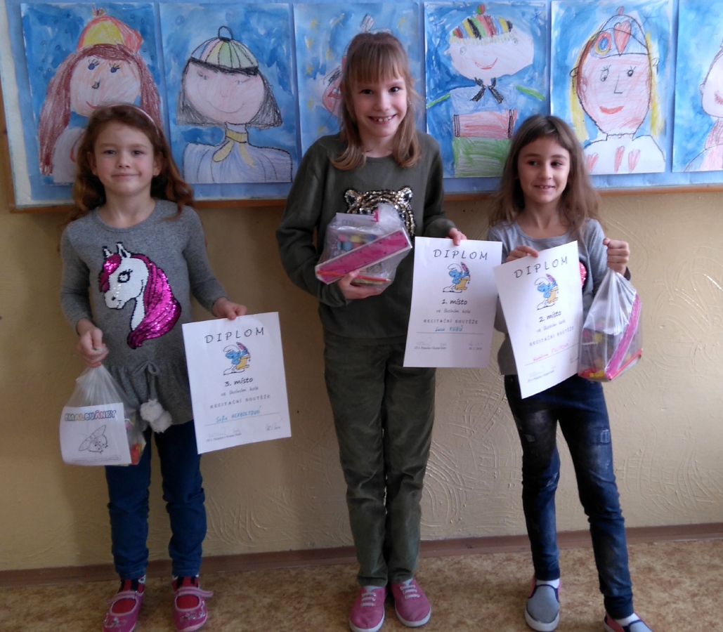Ve školním kole recitační soutěže v kategorii prvních tříd získala první místo Lucinka Kubů, druhé místo Kačenka Filipová a třetí Sofinka Herboltová.