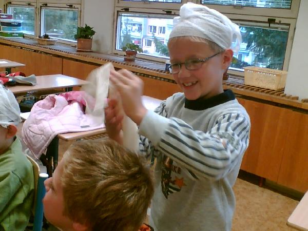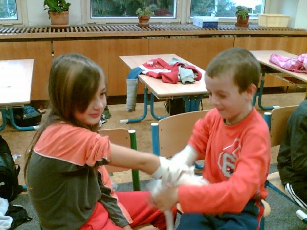 . Když jsme se vrátili do třídy, tak to teprva nastala švanda.... vytáhli jsme obvazy a motali je na různé části našeho těla. Nejvíc jsme se nasmáli když každému vyrostla na hlavě obvazová čepička