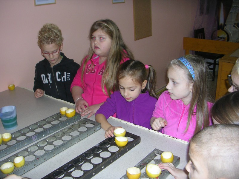 Děti si barevně ozdobily svíčku a zkusily si vykrojit voňavé mýdlo. Vyrobily si svíčku z citronu a podle své fantazie si namíchaly voňavou koupelovou sůl.
