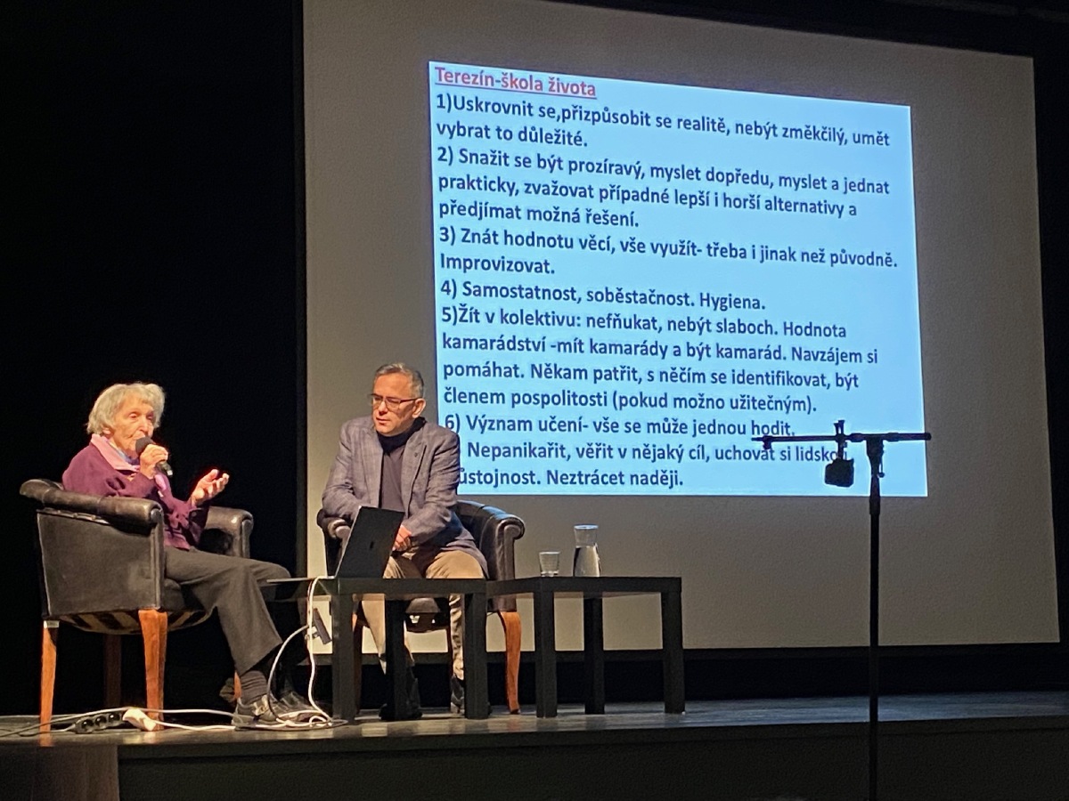 Deváťáci naší školy měli výjimečnou příležitost zúčastnit se besedy s paní Michaelou Vidlákovou, pamětnicí holokaustu, která přežila pobyt v terezínském ghettu.