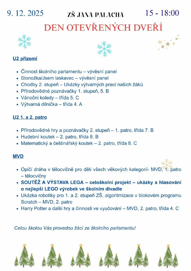 Srdečně zveme na bohatý program ZŠ Jana Palacha během Dne otevřených dveří i na unikátní procházku "Vánočním lesem"!