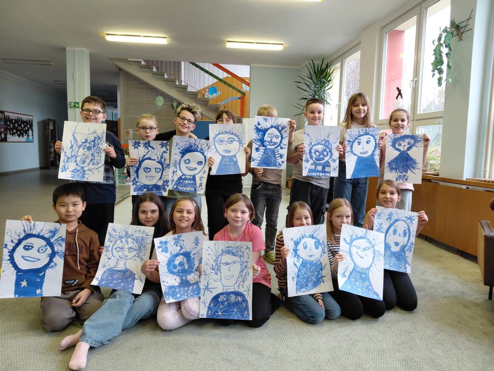 Paní Zimu jsme tvořili rozfoukáváním modrého inkoustu brčkem, zdobili zmizíkem. Práce nás bavila a moc se nám povedla