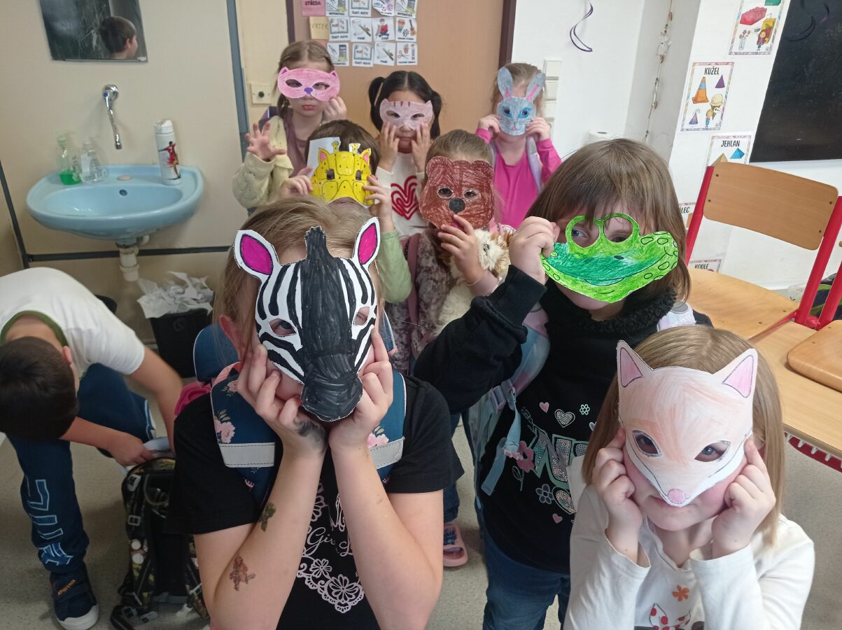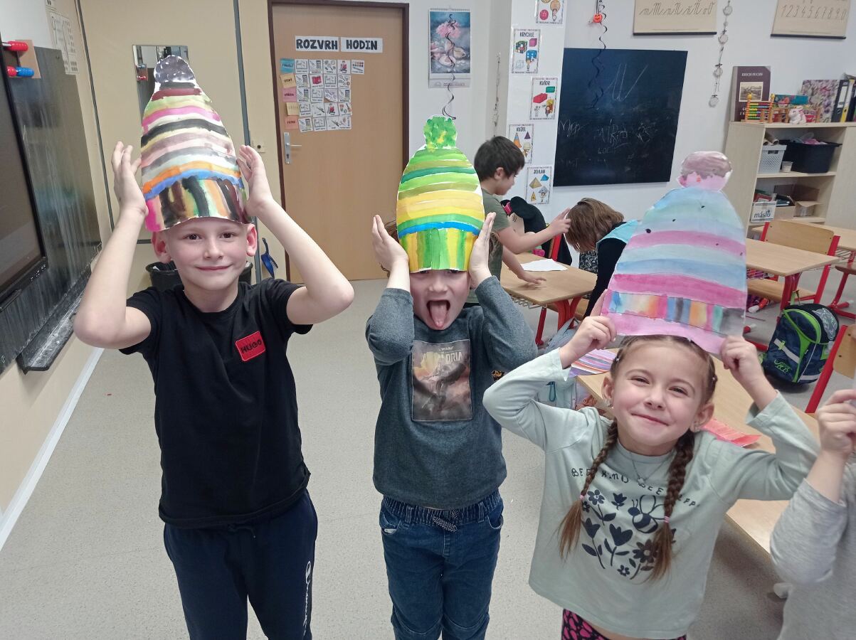Lednové a únorové počasí se nám předvádí ve všech svých podobách. Sníh, mráz, led, ale i déšť a sluníčko. A tak jsme si nejpve "nasadili" barevné proužkované kulichy a potom jsme se "vydali" na maškarní bál. Podívejte, jak nám to sluší!!!![]()