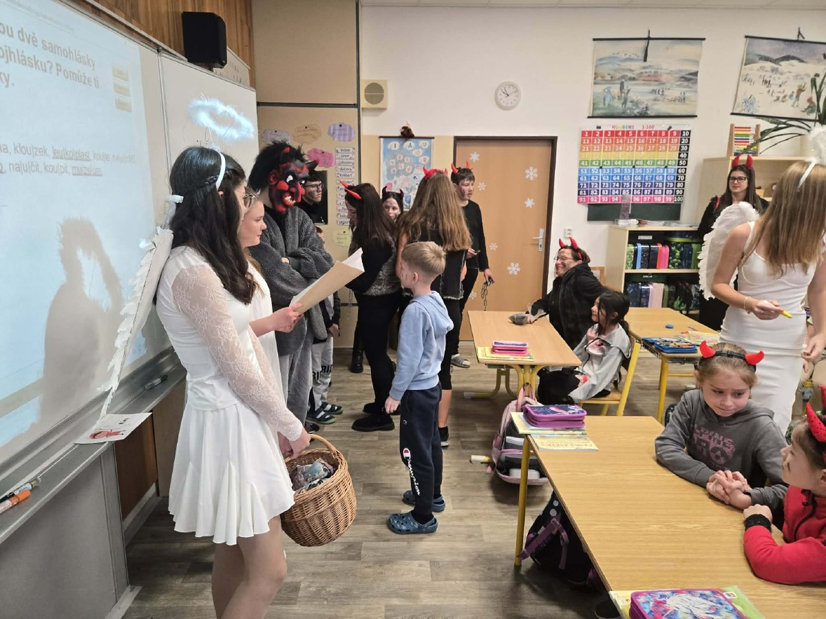 Dnešek byl pro 2.B ve znamení čertů a andělů. Už od rána jsme všichni netrpělivě vyhlíželi Mikuláše se svou družinou a třetí hodinu jsme se konečně dočkali. Zazpívali jsme mu koledu a on nás za to obdaroval malou pozorností. Celým dnem nás Mikuláš, čerti o andílci provázeli v podobě projektového vyučování, kde jsme opravovali čertovské příklady, počítali balíčky od Mikuláše, zahráli si běhací diktát a mnoho dalšího. Den se všem moc líbil, už se těšíme na další rok.