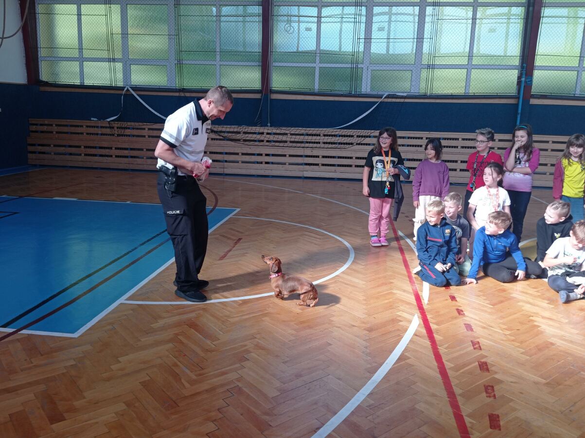 Na krátké procházce v okolí školy jsme si zopakovali bezpečné chování v silničním provozu a dopravní značky. Potom jsme se vrátili do školy, kde jsme si povídali, jak se zachovat v různých krizových situacích. Na závěr nás čekala beseda s policistou, panem Krupičkou a jeho pejskem. Mohli jsme si také prohlédnout a "vyzkoušet" policejní auto. Děkujeme!!!