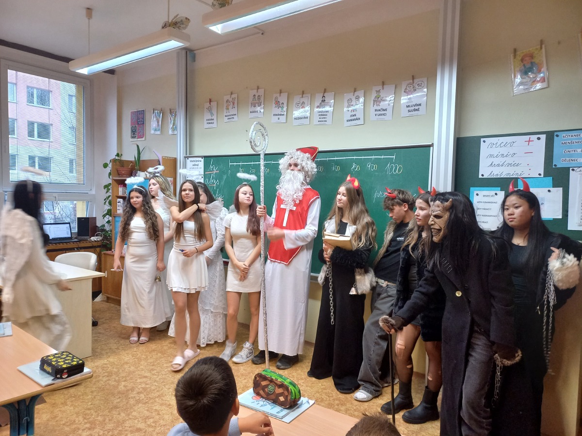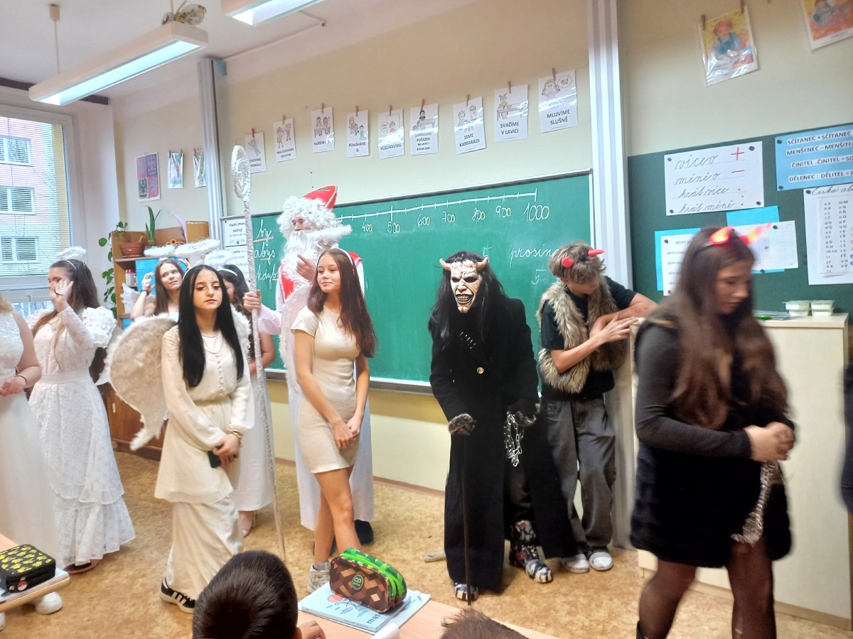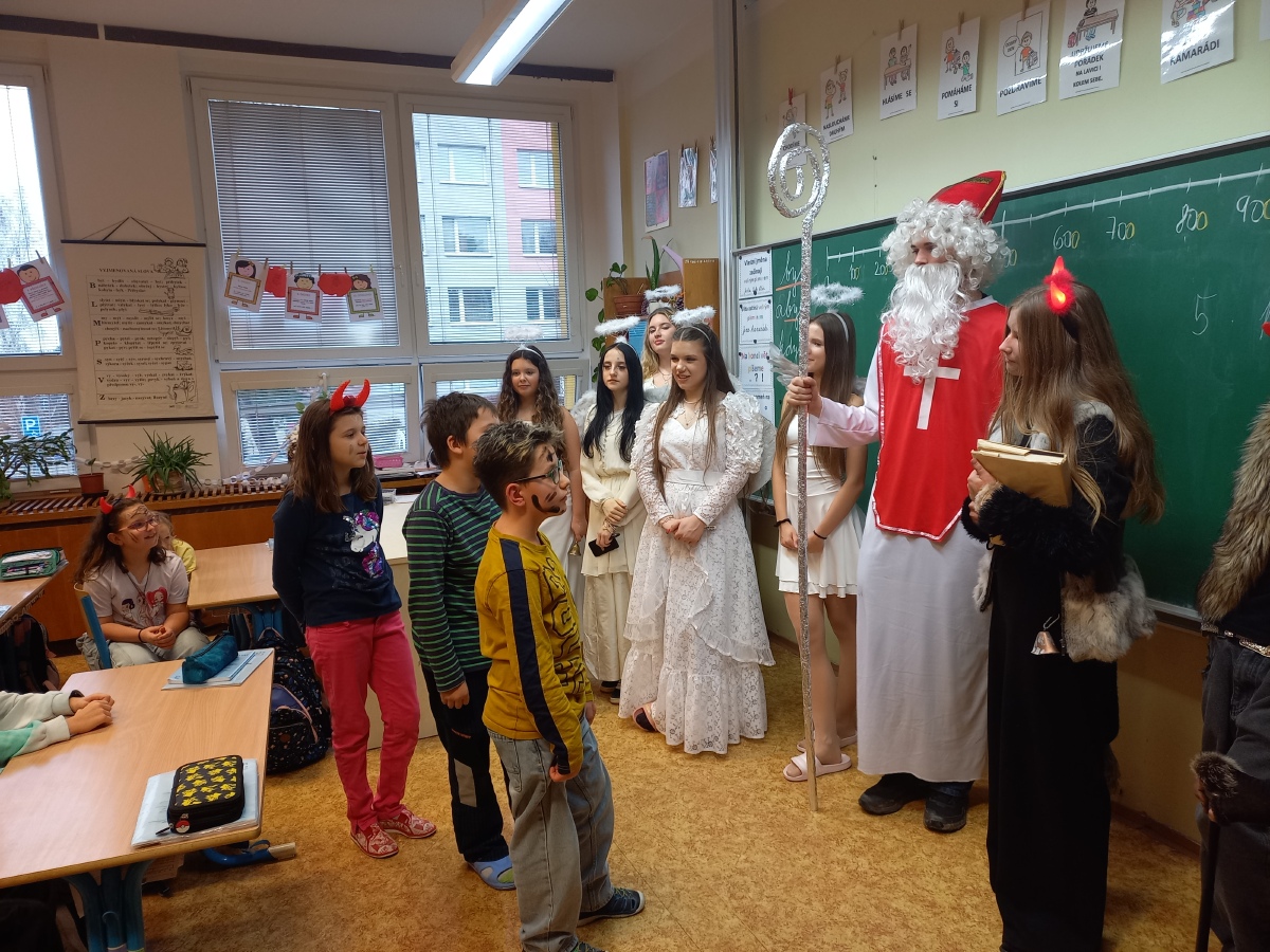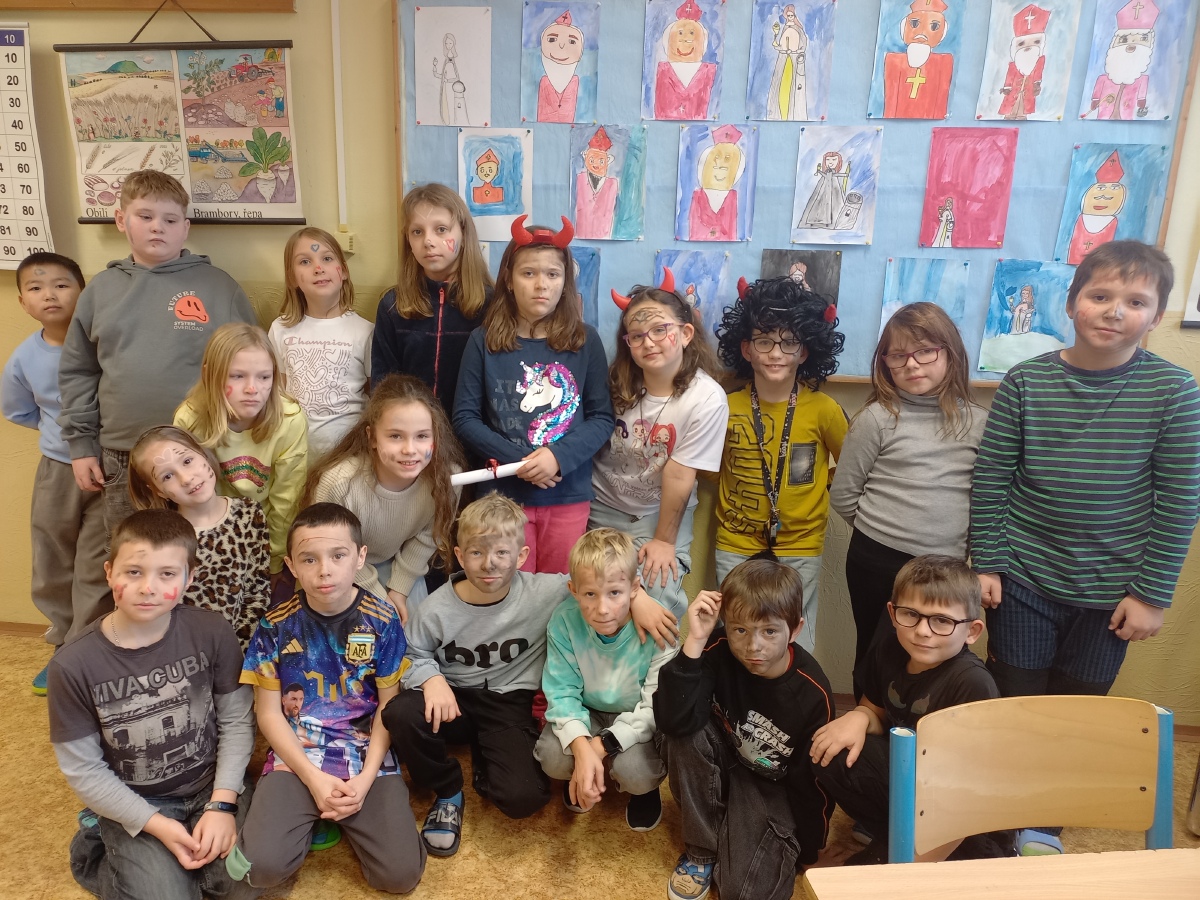 Také letos nás 5. prosince navštívil Mikuláš. Přivedl si s sebou pár krásných andílků, ale také něholik hrozivých čertů. Ti, kteří trochu zlobili, slíbili, že se polepší. Dostali jsme nějaké sladkosti, ovoce, adventní kalendář. Většina z nás se trochu bála, ale jsme rádi, že jsme strach překonali.