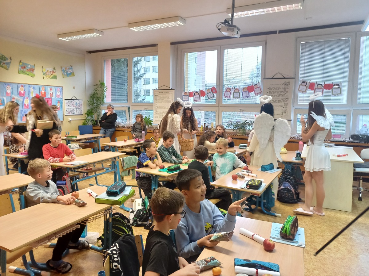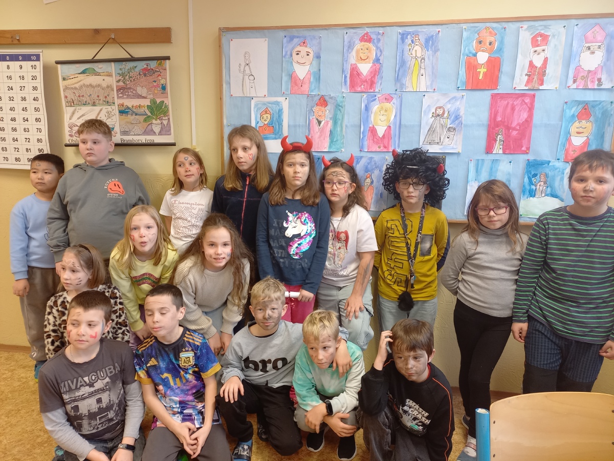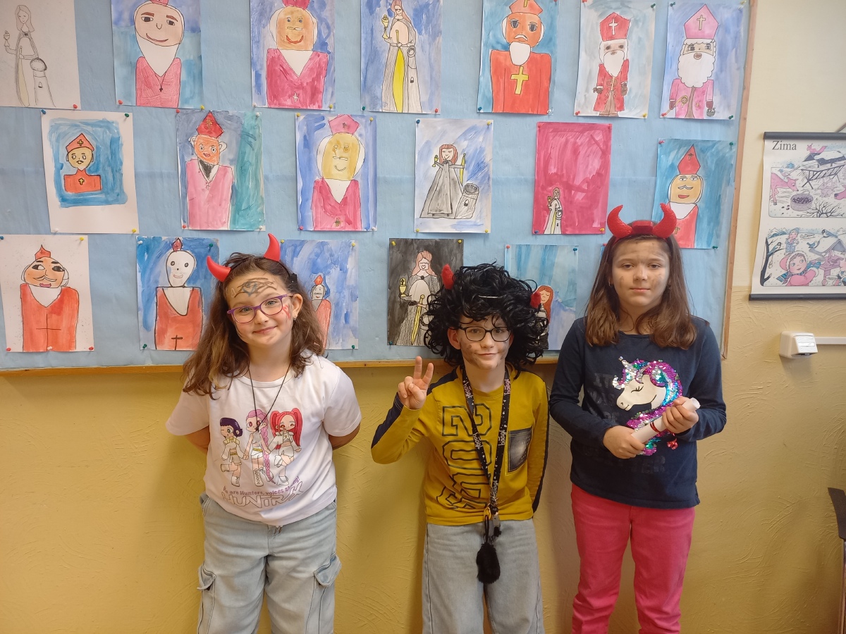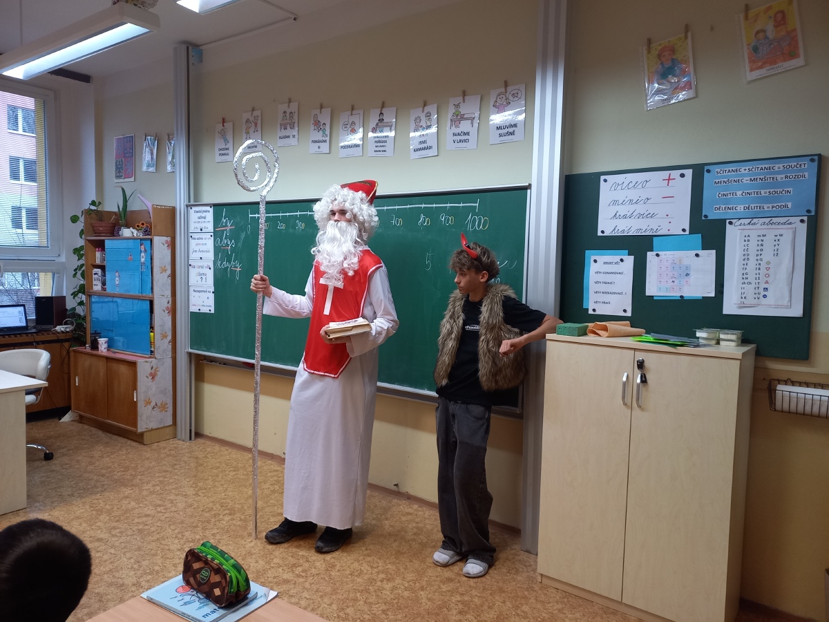 Také letos nás 5. prosince navštívil Mikuláš. Přivedl si s sebou pár krásných andílků, ale také něholik hrozivých čertů. Ti, kteří trochu zlobili, slíbili, že se polepší. Dostali jsme nějaké sladkosti, ovoce, adventní kalendář. Většina z nás se trochu bála, ale jsme rádi, že jsme strach překonali.