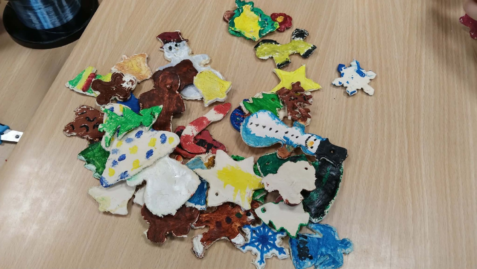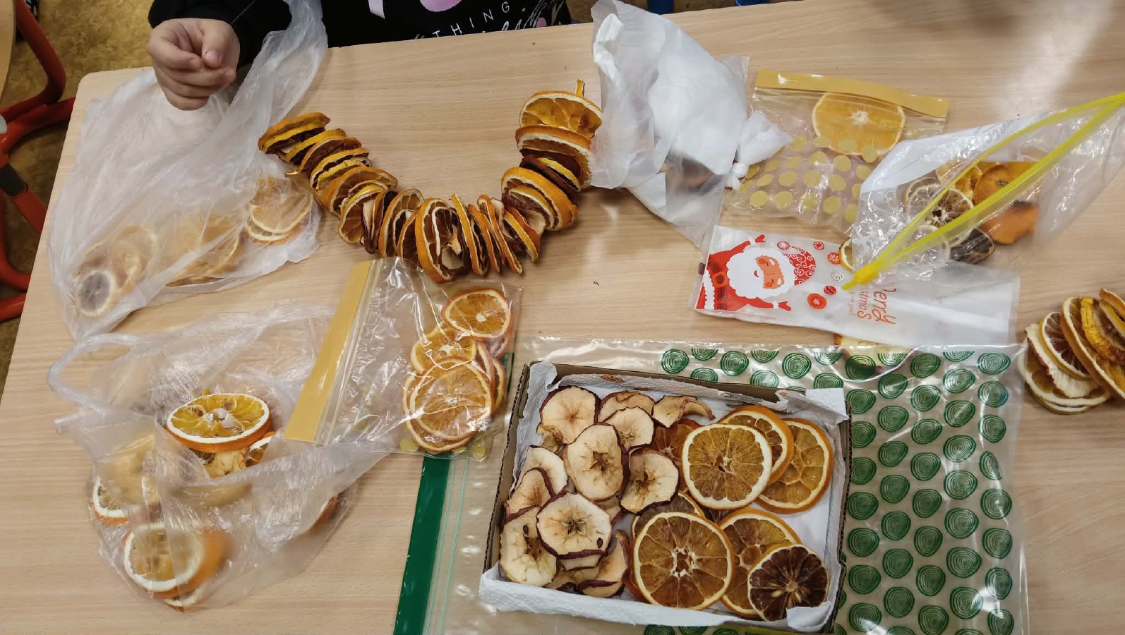 V průběhu prosince děti vyráběly krásné ozdobičky ze samotvrdnoucí hmoty a řetězy z ovoce.